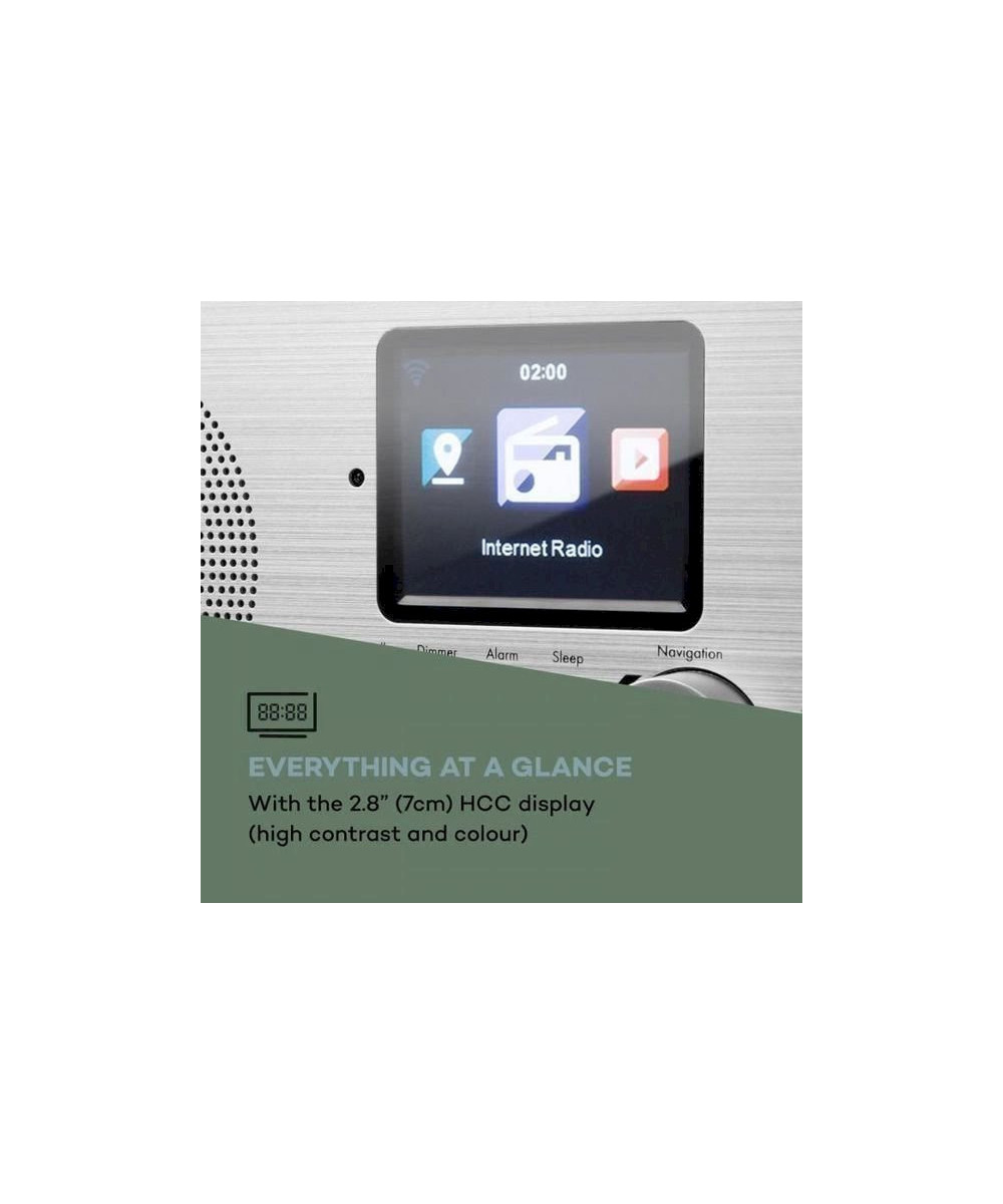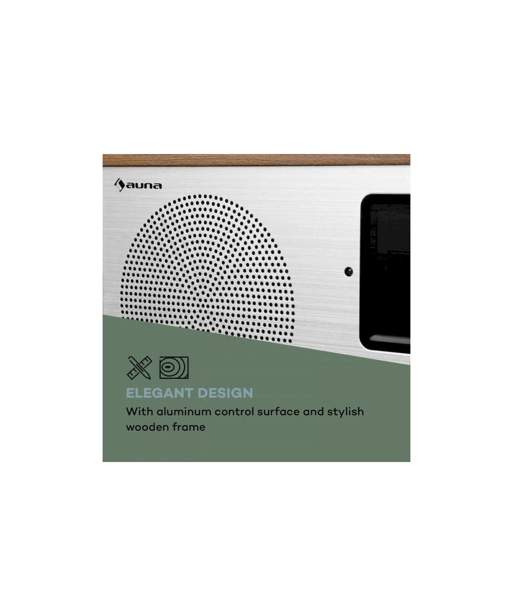 Il est temps de passer au plaisir de la musique de haute qualité ! Avec la mini radio Internet DAB +/FM auna Silver Star, vous pouvez offrir un appareil musical polyvalent à votre foyer, qui combine des performances puissantes, des fonctionnalités multiples et un design élégant en un seul appareil. Avec une puissance de sortie de 8 watts RMS, la radio tout-en-un offre la meilleure qualité sonore en tant qu'élément stationnaire dans la cuisine, la salle de bain ou le salon. La fonction Bluetooth intégrée est idéale pour les connexions sans fil, permettant de lire rapidement et facilement le contenu multimédia des périphériques externes. L'interface WiFi de la radio permet de recevoir jusqu'à 10 000 stations de radio Internet et d'utiliser l'appareil en tant que lecteur réseau. La radio est couplée sur le réseau avec d’autres appareils via l’application Air Music Control et permet la diffusion de musique avec le protocole UPnP/DLNA. Avec le tuner DAB+, vous pouvez recevoir en qualité numérique toutes les stations de radio en plus du tuner FM analogique, et profiter ainsi de la meilleure qualité sonore avec un son stable et sans parasite. Les services texte et image supplémentaires de DAB+ sont particulièrement mis en valeur par le large écran : les guides de programmes, les informations, les nouvelles, les morceaux de musique sont facilement lus sur un écran de 2,8" (7 cm) HCC (contraste élevé et couleur). Ceux qui voudraient aussi utiliser d'autres sources de musique disposent de l'entrée ligne et d'un port USB à l'arrière qui ouvrent le système audio à d'autres sources sur smartphone, ordinateur portable, lecteur USB et lecteur MP3. La radio Intenet se contrôle par son panneau de commande à l'avant ou confortablement via la télécommande ou l'appli Air Music Control. La fonction d'alarme avec double alarme programmable et le mode snooze se révèle également utile. Au-delà des détails techniques, la radio séduit aussi avec son cadre en bois qui donne son élégance particulière à cet appareil polyvalent avec surface de contrôle en aluminium et augmente ainsi la valeur de l'appareil.