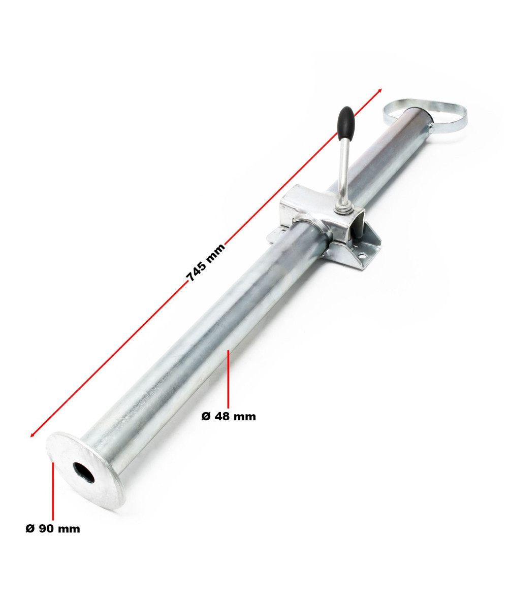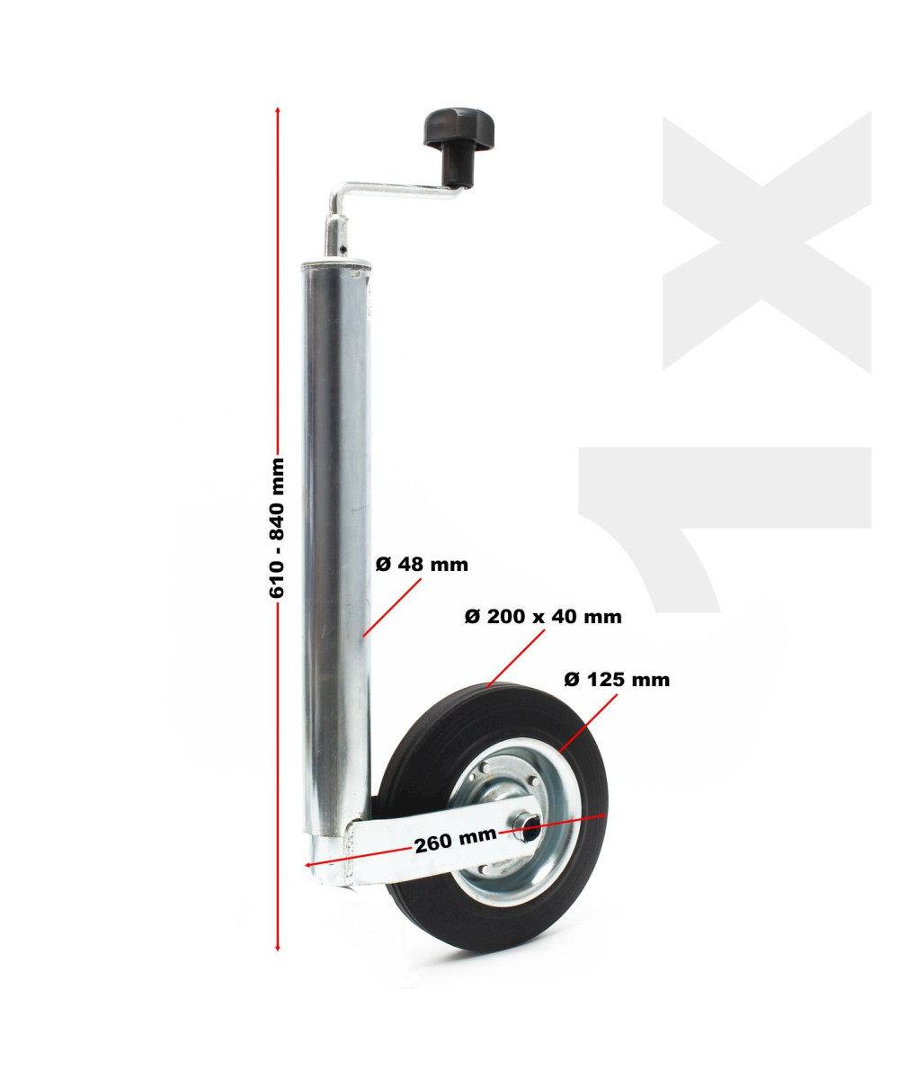 Fabriquée en acier galvanisé de haute qualité, la béquille peut supporter une charge allant jusqu’à 150 kg. La roue de support se règle en hauteur, ce qui permet d’attacher ou de détacher très facilement l’attelage à rotule. Les pneus en caoutchouc plein avec une jante en acier, se caractérisent par l’avantage d'empêcher les fuites d'air du pneu et éviter ainsi, tout risque de crevaison.