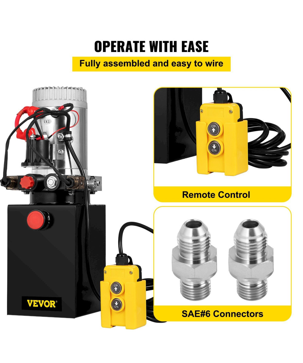 Notre pompe hydraulique électrique a été entièrement assemblée. Elle est livrée avec une télécommande portable et 2 connecteurs SAE#6 supplémentaires pour le remplacement. L'ensemble de l'unité de puissance est facile à câbler et à utiliser. - Démarrage & Levage Rapide