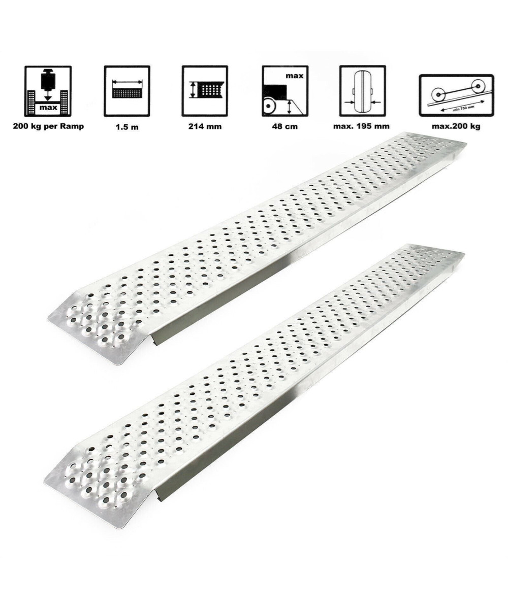 Les rampes ont une longueur de 150 cm et peuvent supporter un poids de 400 kg (200 kg par rampe). Ils conviennent pour des pneus jusqu'à une largeur de 195 mm et, grâce à leur conception droite et à leur poids de 3,5 kg par rampe, ils peuvent être facilement rangés.