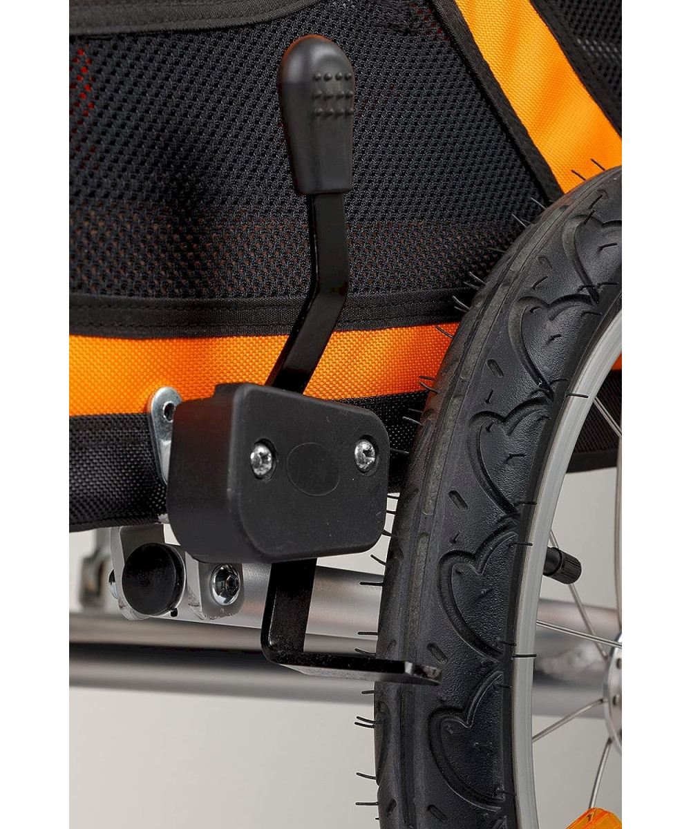 Deichsel, Kupplung ohne Drehsicherung, Feststellbremsen, Gummimatte, Reflektoren, LED-Rücklicht, Batterien, Sicherheitsleine