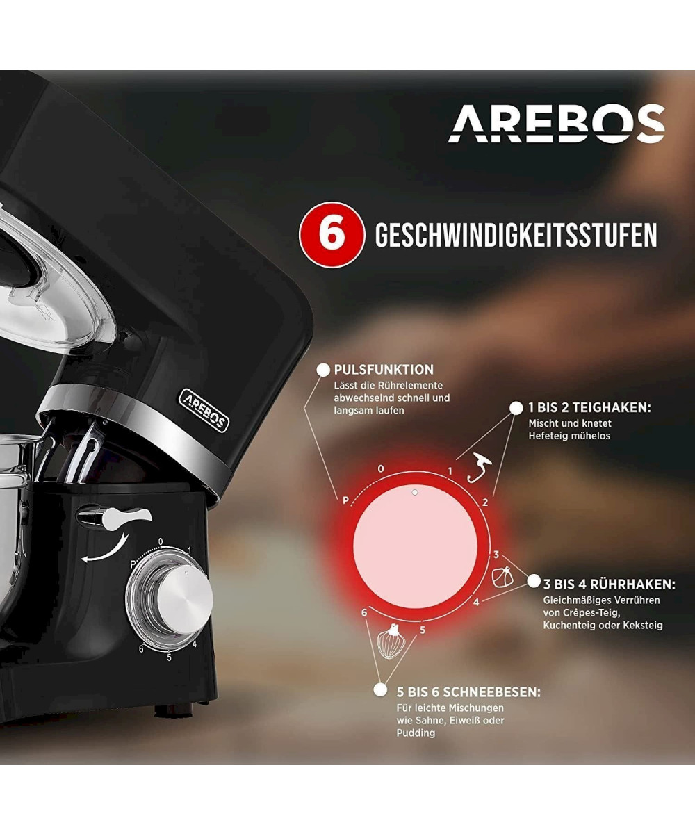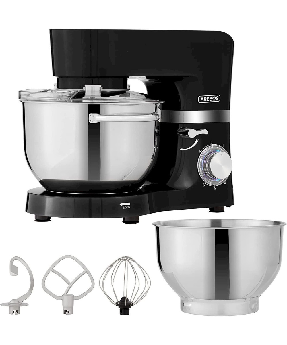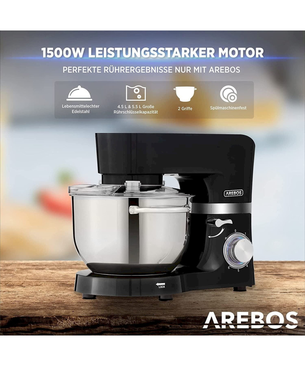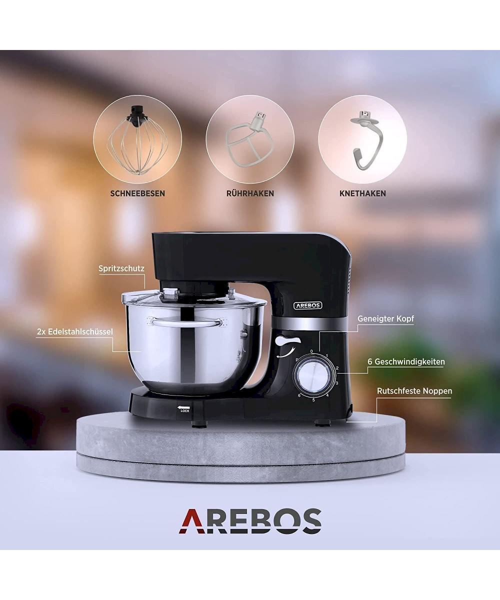 Robot de Cuisine Multifonction 1500W avec Fouet, Batteur, Crochet, 2 Bols d'Acier Inoxydable, 6 Vitesses + Pulse, noir