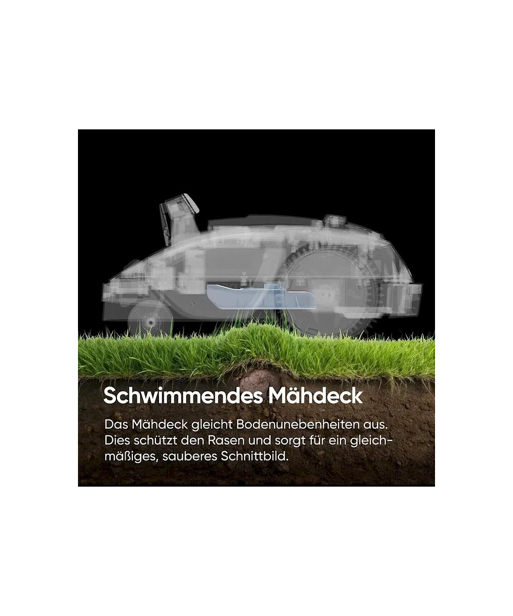 Der intelligente Algorithmus optimiert kontinuierlich die Routenplanung, um perfekte Mähergebnisse und makellose Rasenkanten zu garantieren. Das schwimmend aufgehängte Mähdeck gleicht Bodenunebenheiten mühelos aus und sorgt für einen gleichmäßigen Schnitt. Dank kraftvollem Hinterradantrieb sind auch Steigungen bis 42 % kein Problem.