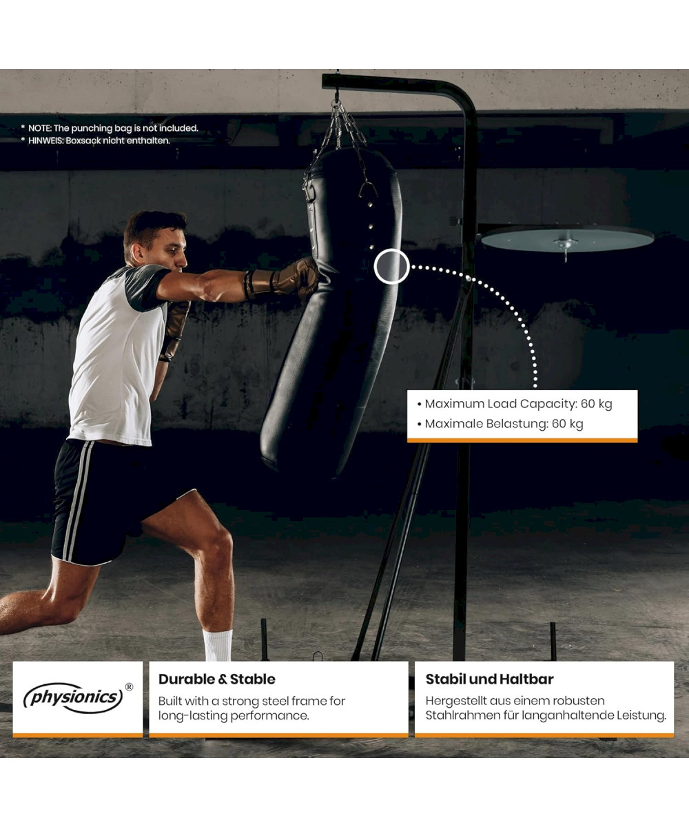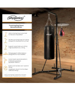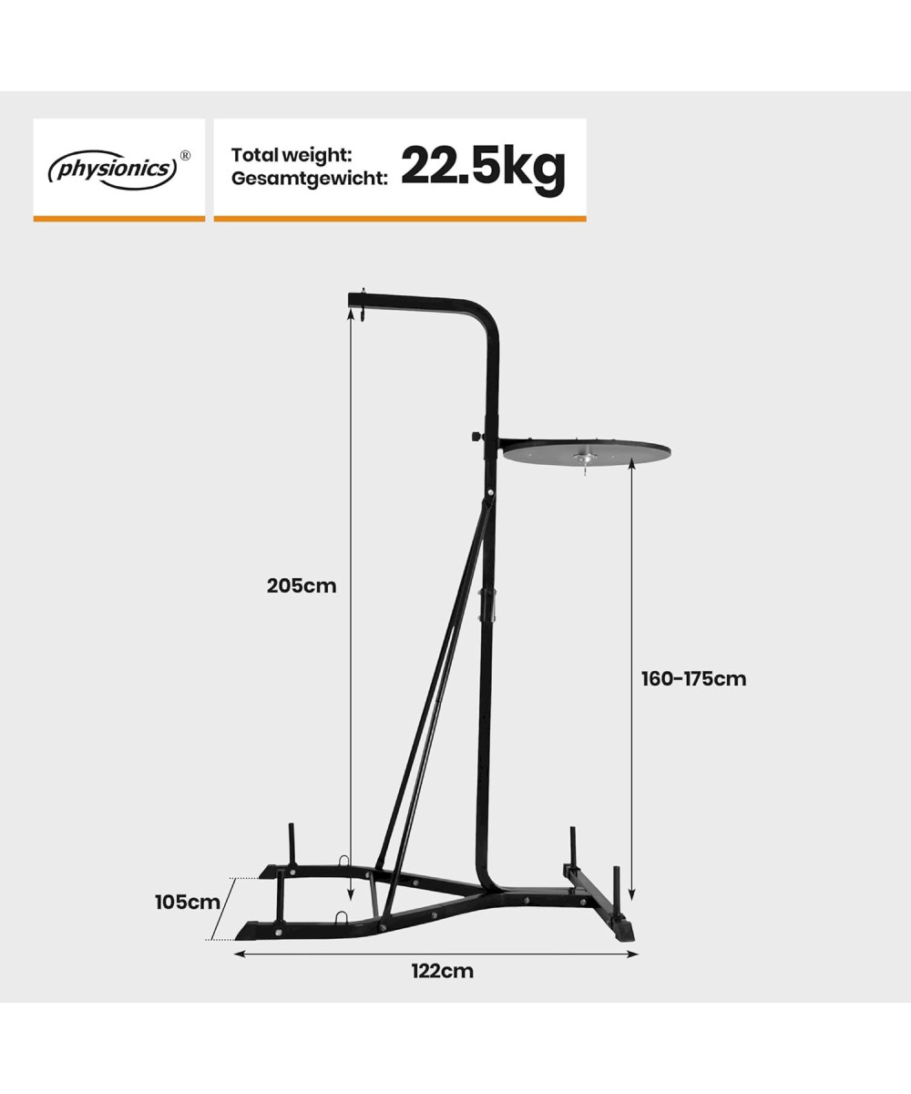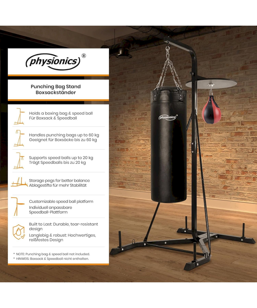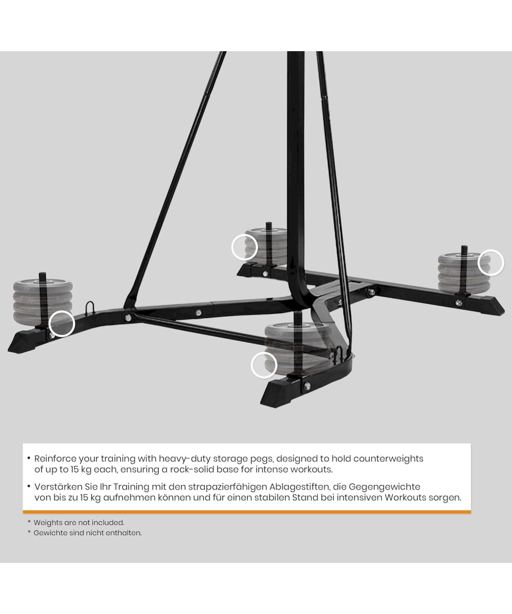 Fabriqué en acier robuste et doté d'une base solide et stable, ce support 2 en 1 est destiné à être utilisé pour suspendre des sacs de boxe et des poires de vitesse.