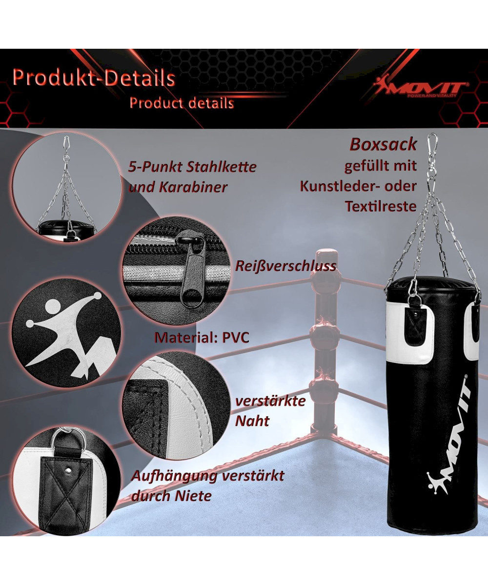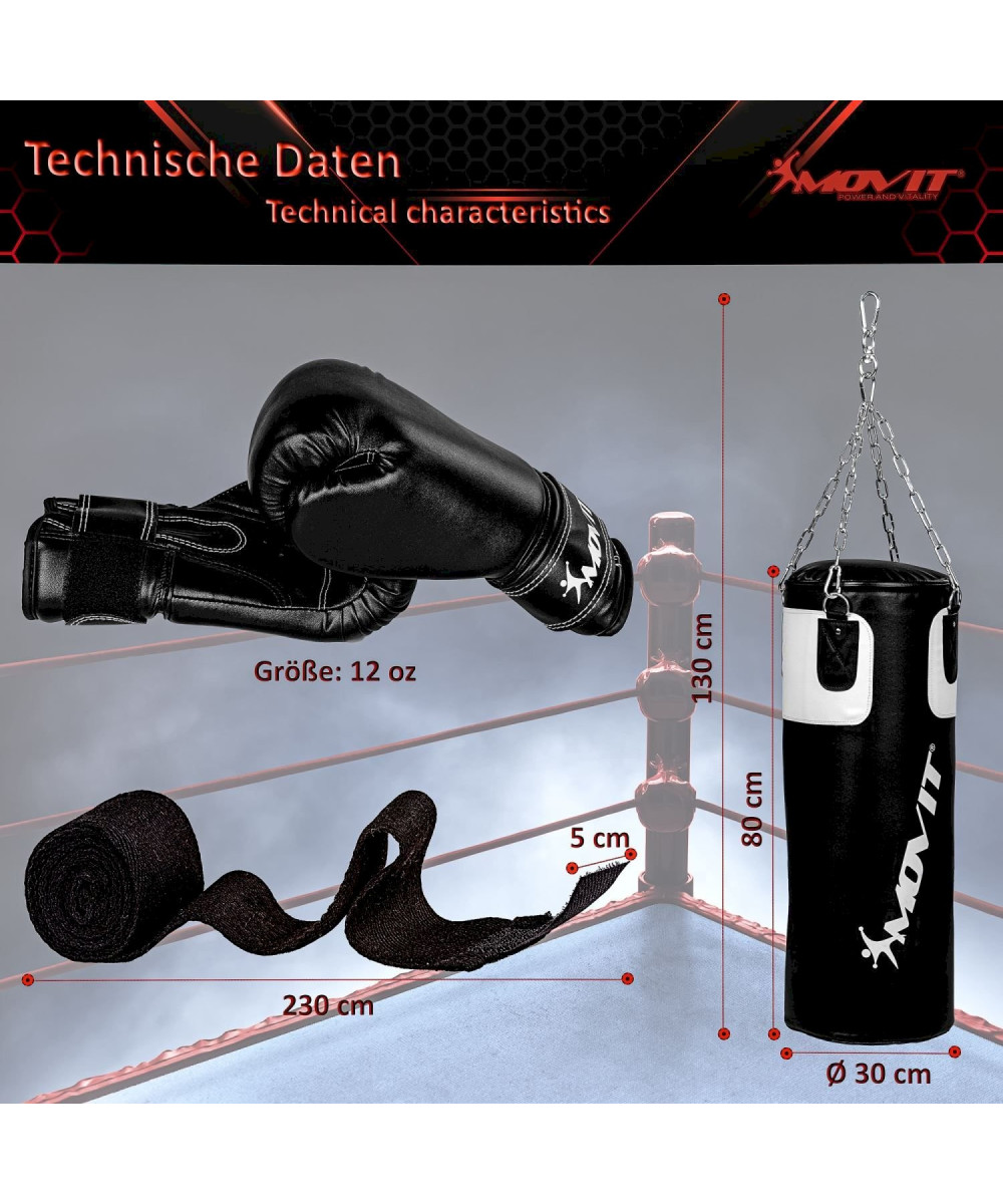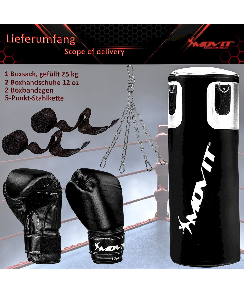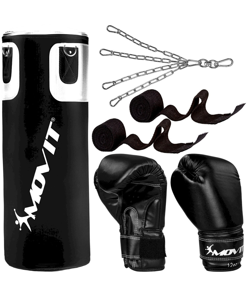- Kit de boxe MOVIT pour adultes - Sac de boxe 25 kg – H 80 cm x diamètre 30 cm – Couleur : noir.