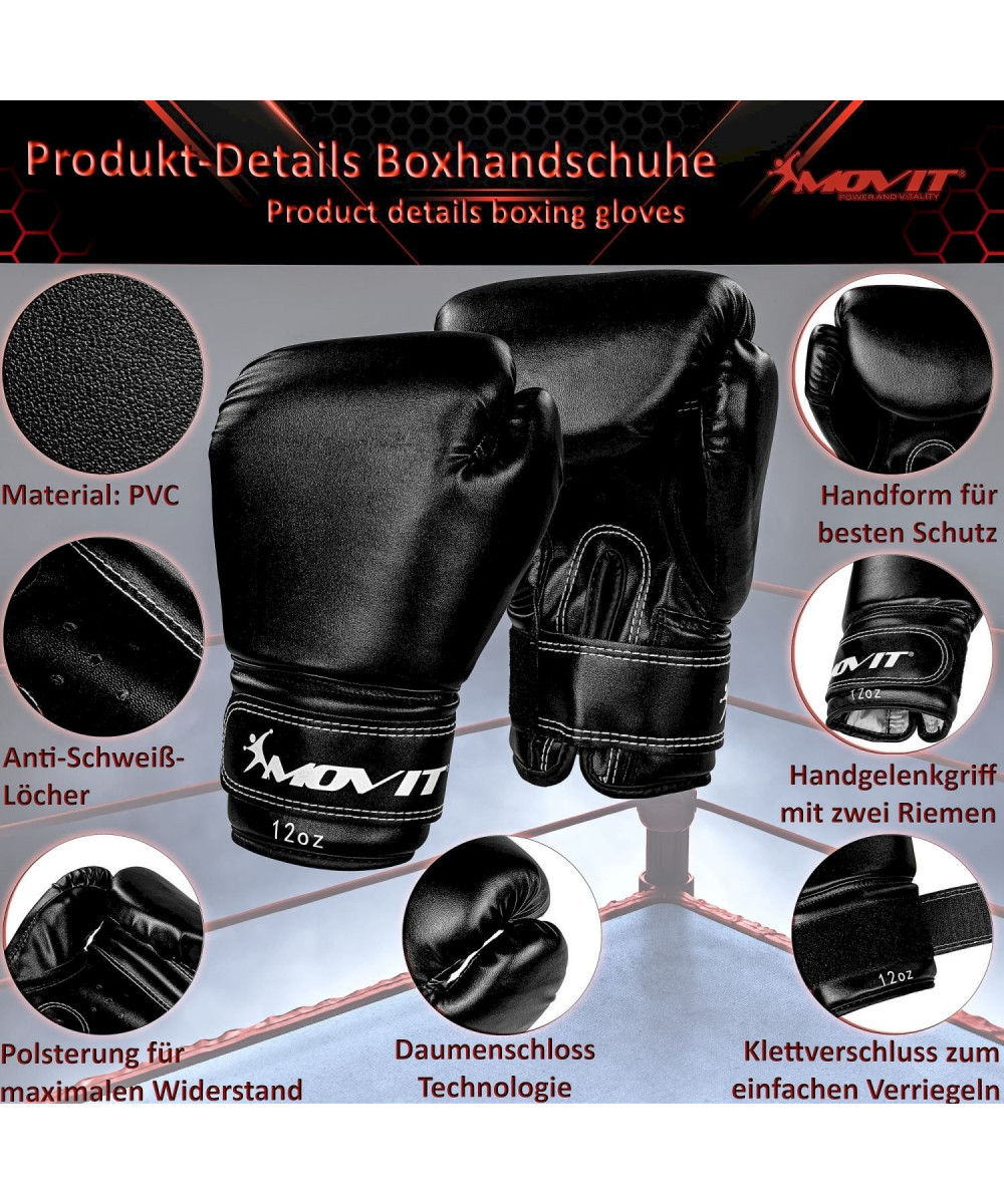 - Gants de boxe 12 oz – Espace pour le pouce – Rembourrés en mousse – Avec sangle de fermeture – Respirants.
