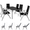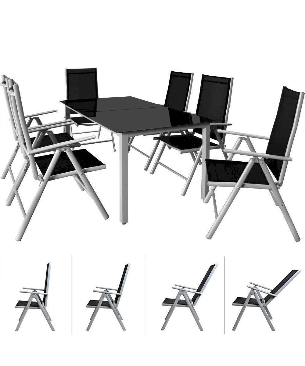Exklusive, 7 tlg. Aluminium Gartengarnitur mit Tischplatte aus hochfestem Sicherheitsglas, klappbaren und in 7 Positionen verstellbaren Hochlehnern