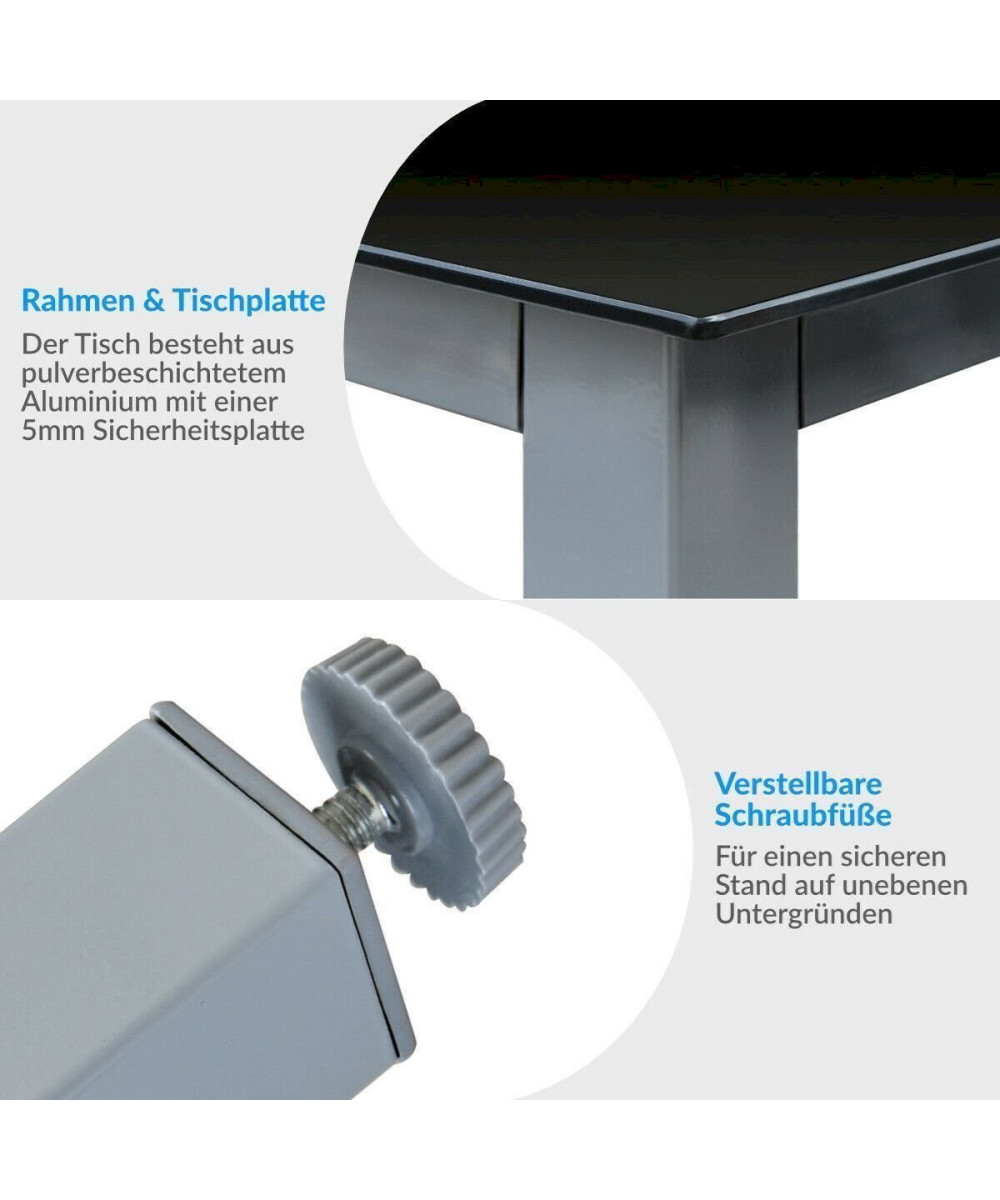 - Material Rahmen Tisch + Stuhl: pulverbeschichtetes Aluminium mit Edelstahlschrauben