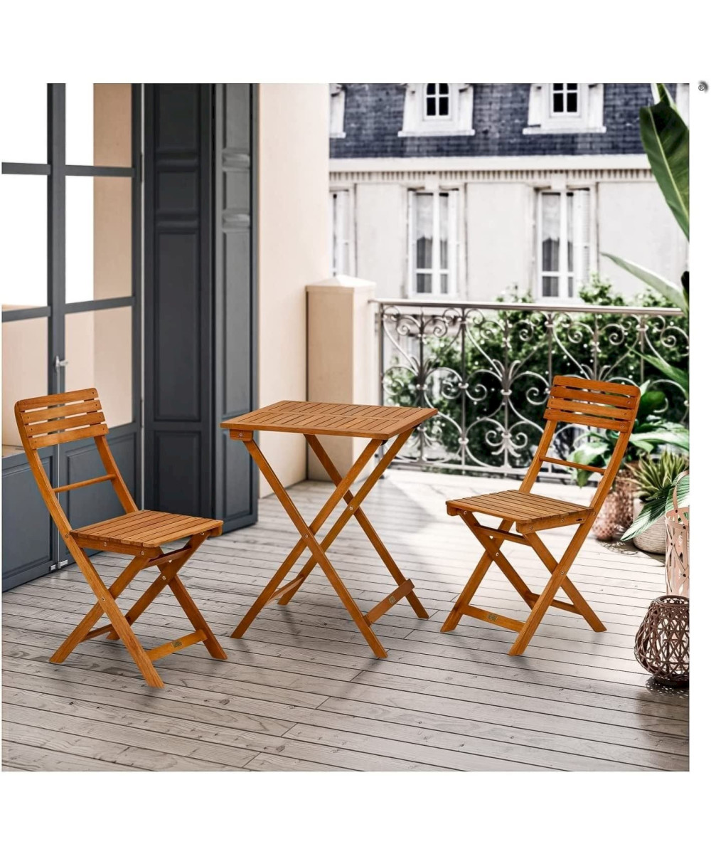 Dimensions de la table : 58 x 58 x 74,5 cm - Dimensions des chaises : 33 x 38 x 85 cm - Hauteur d'assise : 46 cm - Matériau : bois d'acacia