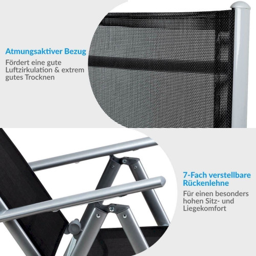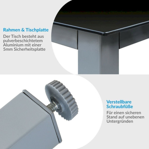 Le plateau de table possède une plaque en verre de sécurité de 5mmd´épaisseur très résistante. Les chaises sont larges etleurs dossiers sont réglables/inclinables en 7 positions.