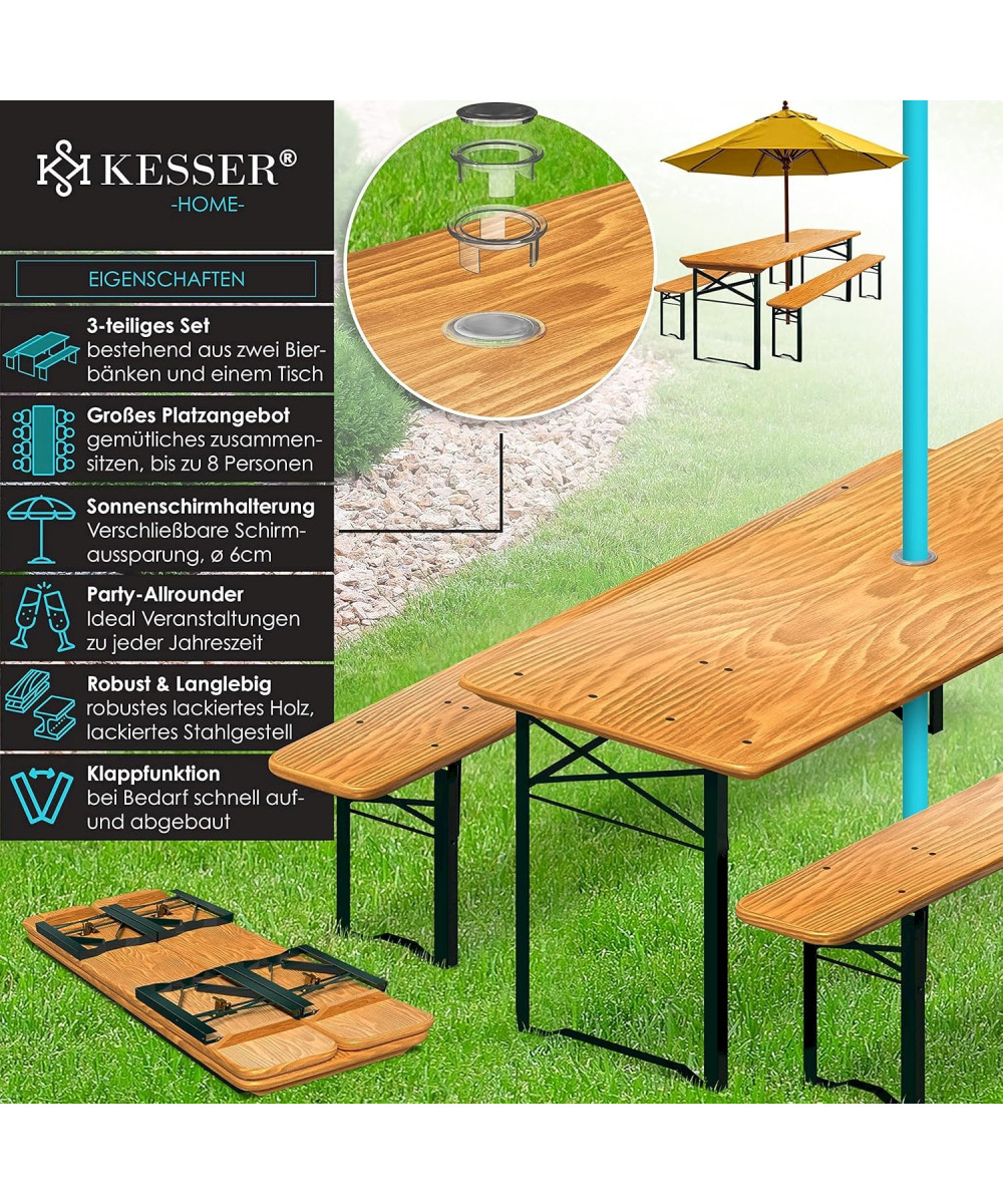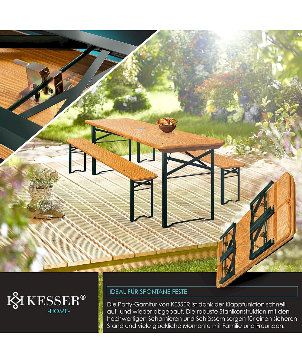 L'ensemble de brasserie KESSER est un ensemble de sièges robuste et durable en bois et en acier, composé d'une grande table et de deux bancs. Avec une longueur totale, la garniture peut accueillir jusqu'à 8 personnes. La table mesure 170 cm x 46 cm x 75 cm (longueur x largeur x hauteur) et est équipée d'un support de parasol (verrouillable) qui peut accueillir un parasol d'un diamètre maximal de 6 cm. Les deux bancs ont chacun une longueur de 170 cm, une largeur de 23 cm et une hauteur de 46 cm.