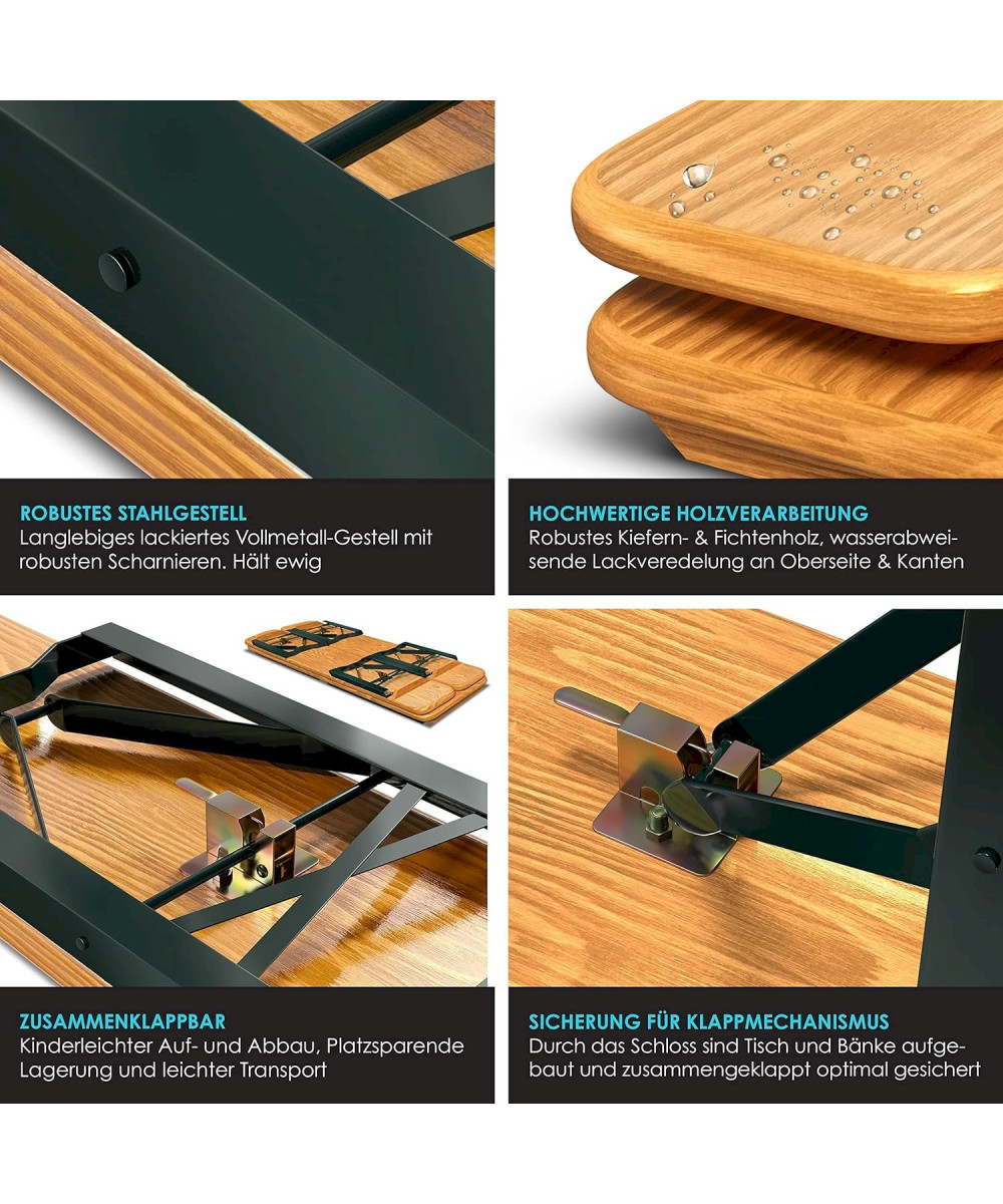 L'ensemble de bancs est fabriqué en pin et en épicéa et est recouvert d'un vernis transparent pour le bois afin de le protéger de l'humidité. Le châssis en acier robuste et les charnières solides assurent une excellente stabilité et rendent l'ensemble particulièrement durable. Les faces supérieures et les bords du bois sont également laqués et assurent un aspect attrayant.