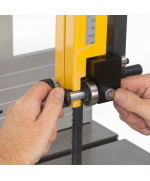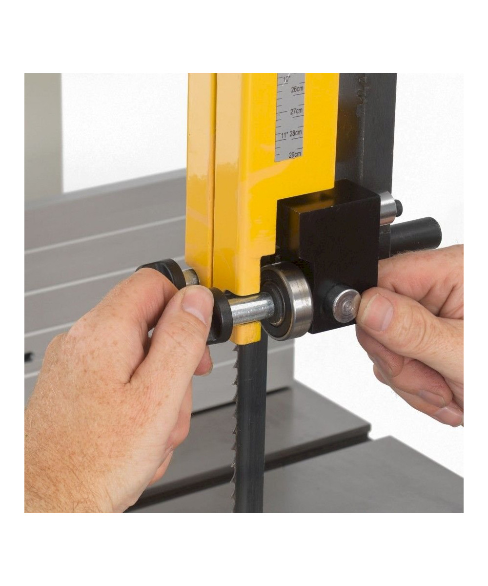 Der Aufbau und die Anordnung der Bandführungselemente wurde optimiert, so dass ein perfektes einstellen auf das jeweilige Bandsägeblatt nicht mehr durch Sicherheitsmerkmale verdeckt wird und die Sichtbarkeit der perfekten Position sofort gegeben ist. -