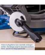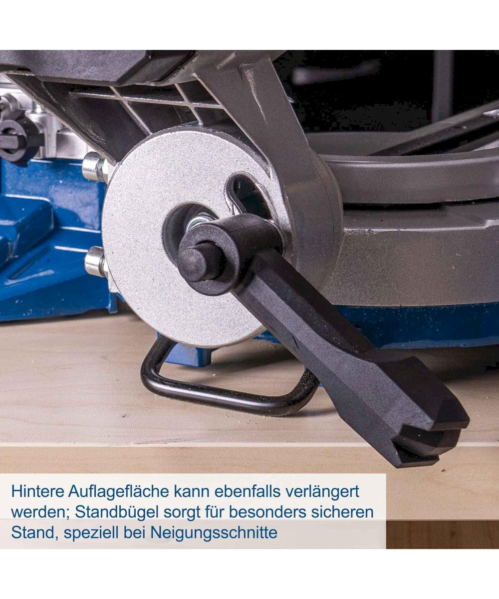 - Élargissement en aluminium, à gauche et à droite de la lame, avec butée escamotable pour un bon support des longues pièces à scier et pour les travaux de série, un presseur à vis assure pour un bon maintien des pièces et un travail sécurisé