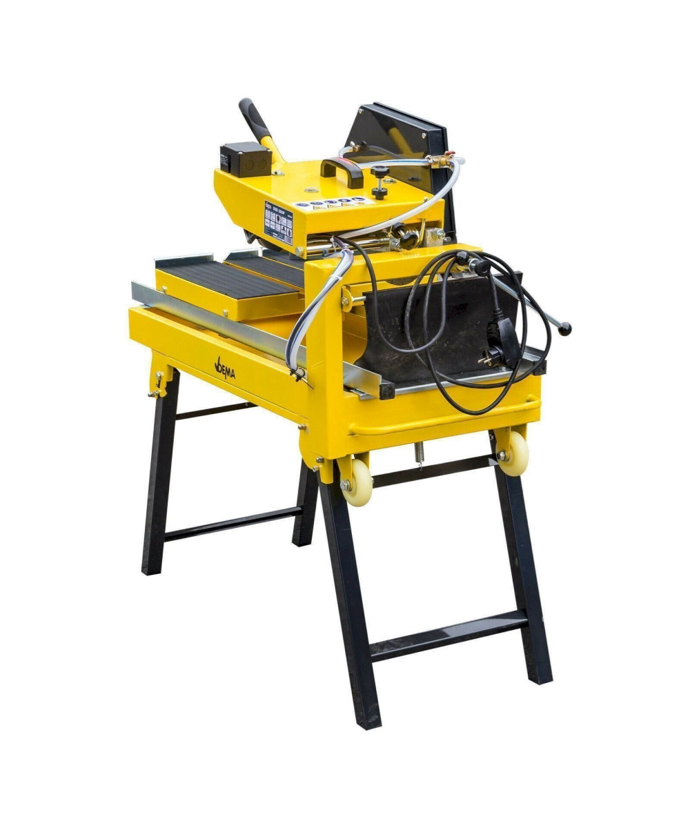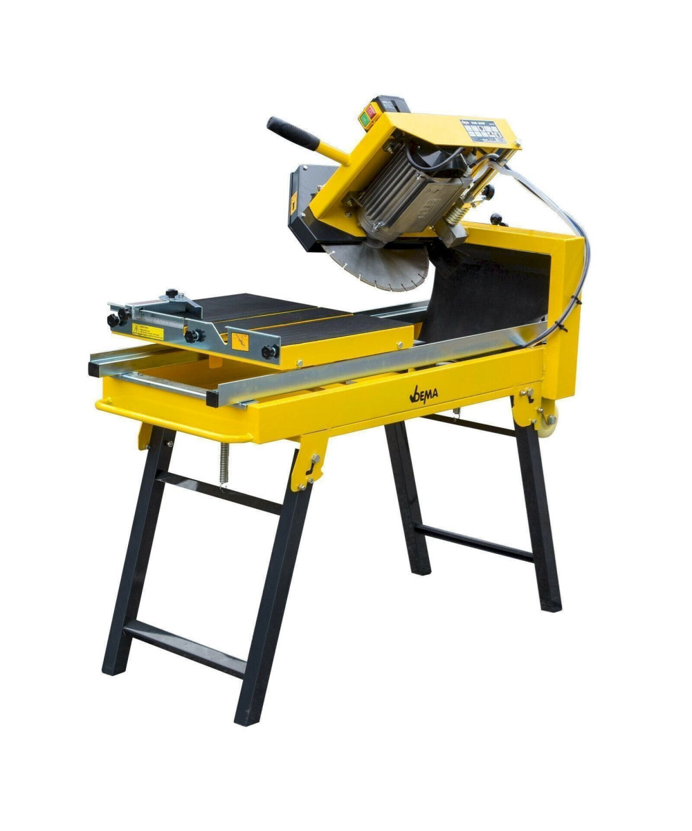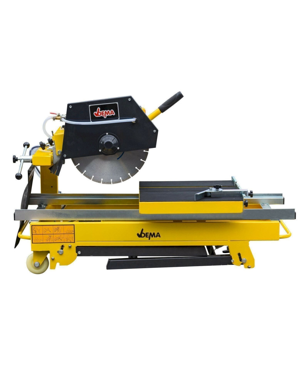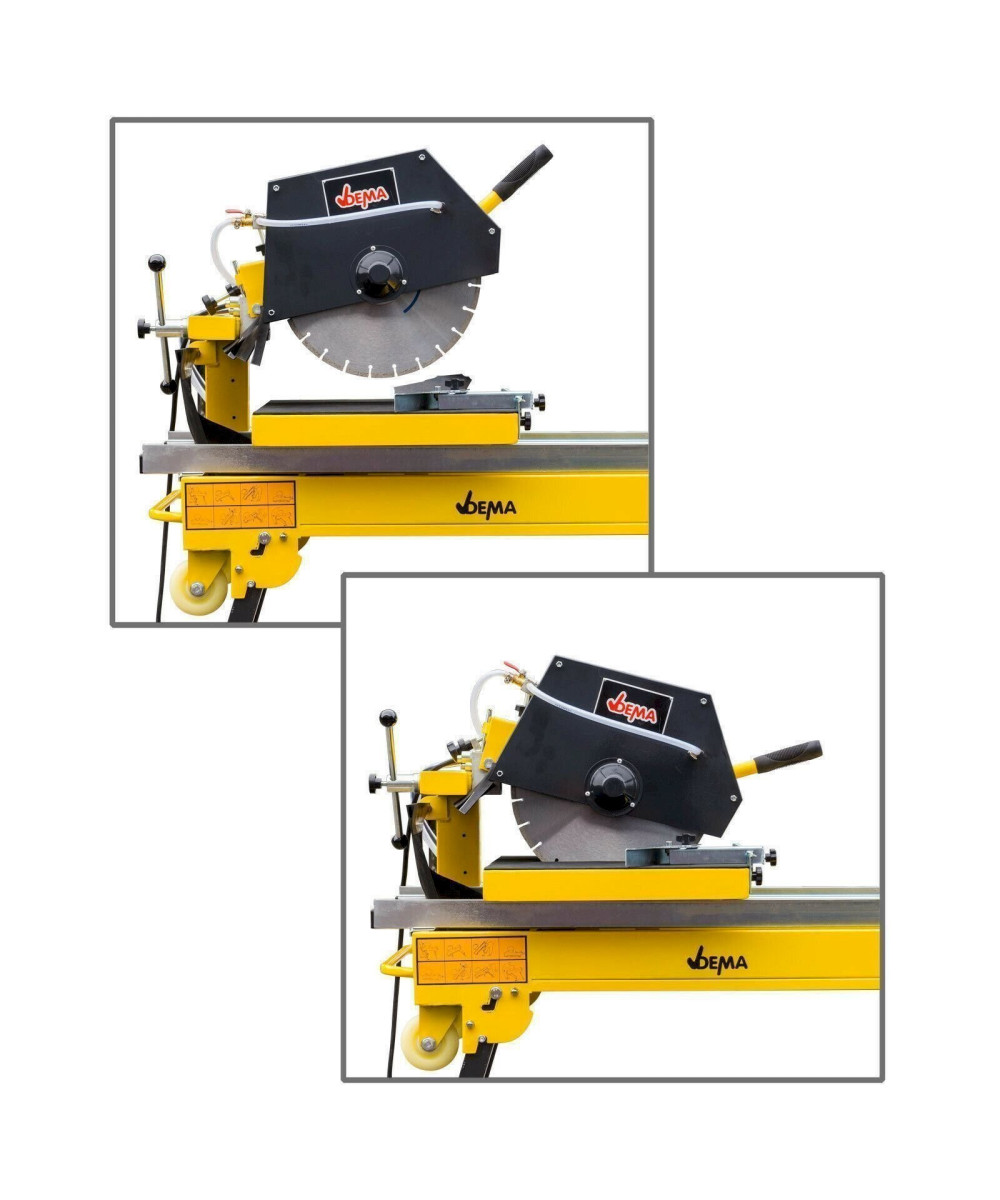 Original DEMA Steinsäge DSS350 P. Eine professionelle Trennsäge mit stufenlos senkbarem und schwenkbarem Kopf zum Schneiden von Baustoffen wie z. B. Betonsteinpflaster, Betonplatten, Klinker, Bordsteine, Randsteine, Fliesen, Dachziegel, Waschbetonplatten, Granit, Marmor, Poroton usw. Durch die hochwertige Ausführung der Diamant-Trennscheibe können Sie mit dem Nassschneidetisch ein breites Spektrum an abrasiven Werkstoffen bearbeiten. Die massive klappbare Unterkonstruktion sorgt für einen sehr stabilen Stand und einfachen Transport. Ein auf hochwertigen Kugellager gelagerte Schubtisch ermöglicht sehr genaue Schnittarbeiten. Auch Gehrungsschnitte sind kein Problem.