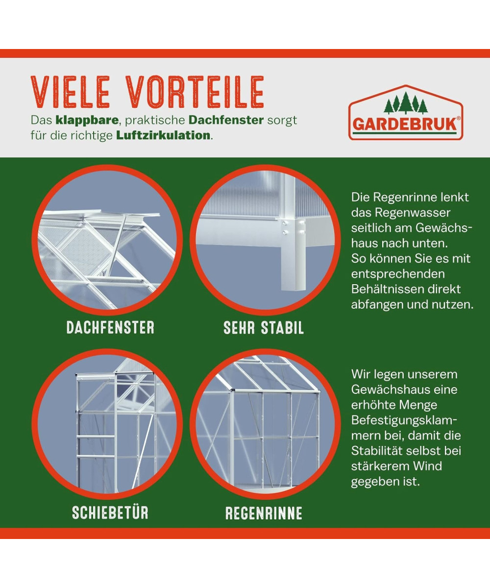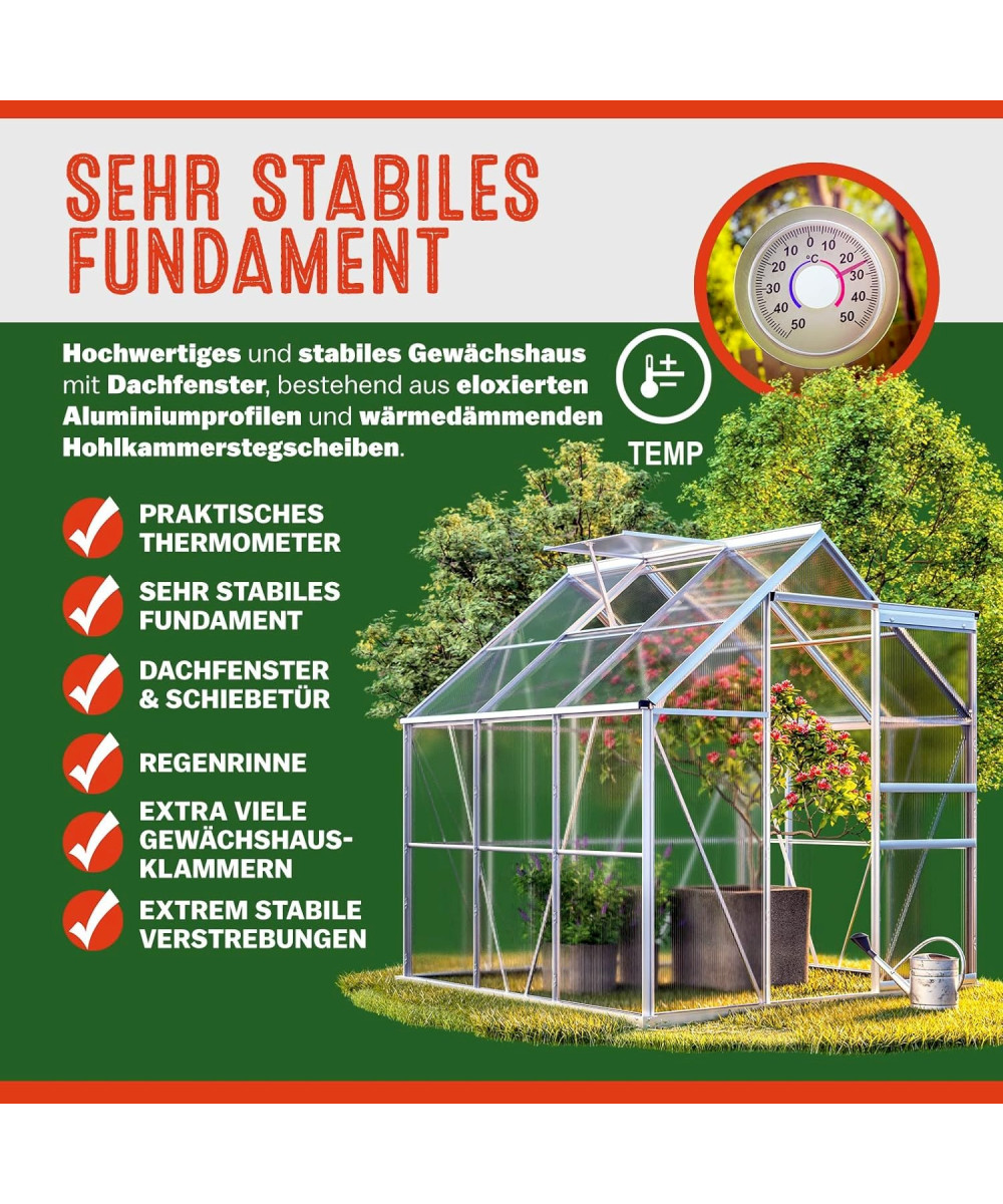 Robuste et de haute qualité, cette serre de jardin est constituée de plaques de polycarbonate creux thermo-isolant et de profilés en aluminium anodisés. Par ailleurs, elle dispose d'une lucarne de toit pratique assurant une ventilation adéquate. Les gouttières situées sur le côté de la serre veillent au bon écoulement de l'eau de pluie et vous permettent de la récupérer à l'aide de récipients adaptés et de pouvoir ainsi la réutiliser.