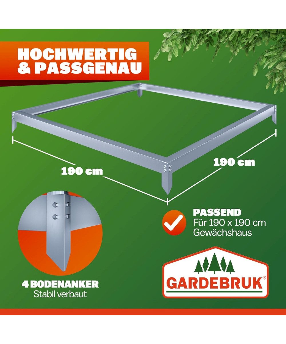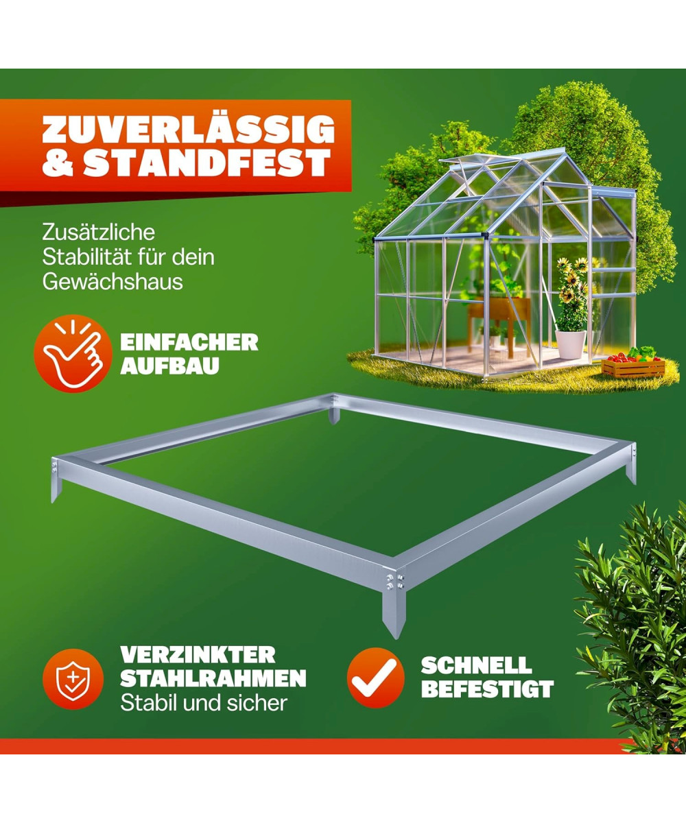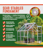 La fondation en acier zingué assure un maintien supplémentaire. Elle conserve la stabilité et la forme rectangulaire de votre serre tout en l'empêchant de s'enfoncer sur un sol mou grâce à son système d'ancrage au sol idéal.