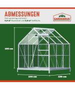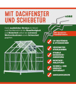 Serre de jardin avec fenêtre de toit, gouttières, surface de 3,7 m³ et un volume de 5,85 m³