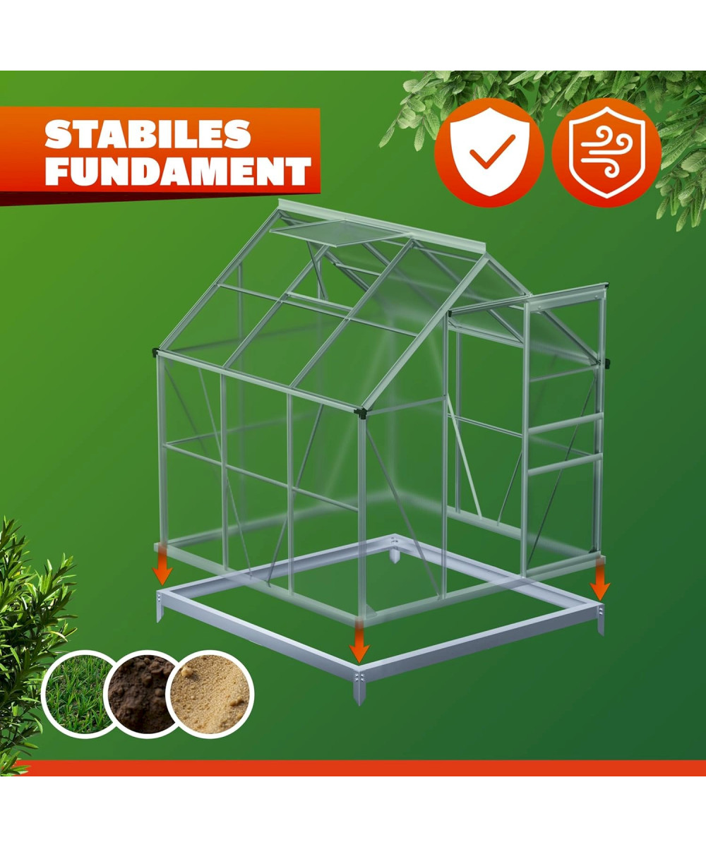Montage : Le cadre est fixé au sol à l'aide de crochets en métal. La serre et sa fondation sont fixées ensemble au moyen de vis et de cornières.