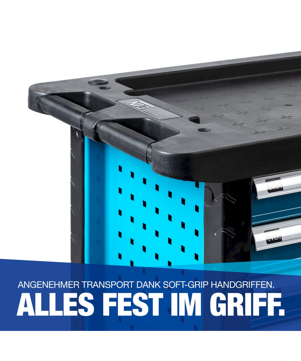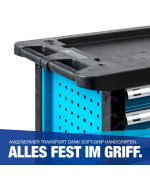 Der Werkzeugwagen wird in der Originalverpackung mit der Spedition ausgeliefert. Es müssen lediglich zur Benutzung die Räder montiert werden.