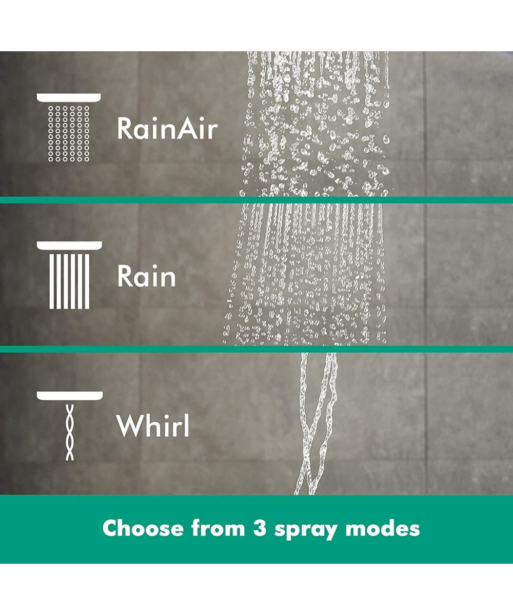 Avec le pommeau de douche Raindance Select S 120 de Hansgrohe, le design moderne et le plaisir de la douche varié. Le pommeau de douche de 125 mm offre trois types de jet assortis. Le jet RainAir produit la sensation originale de la douche à effet pluie de Hansgrohe. Ici, l'eau est enrichie en air (AirPower). Cela crée des gouttes plus denses et plus douces qui libèrent toute la chaleur de l'eau à la peau et qui éclabousse moins Le jet de pluie tonifiant est idéal pour rincer le shampooing, et le jet jacuzzi desserre les muscles tendus. Les types de jet peuvent être commutés très facilement en appuyant sur un bouton (Select).