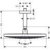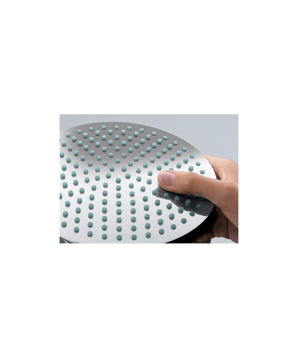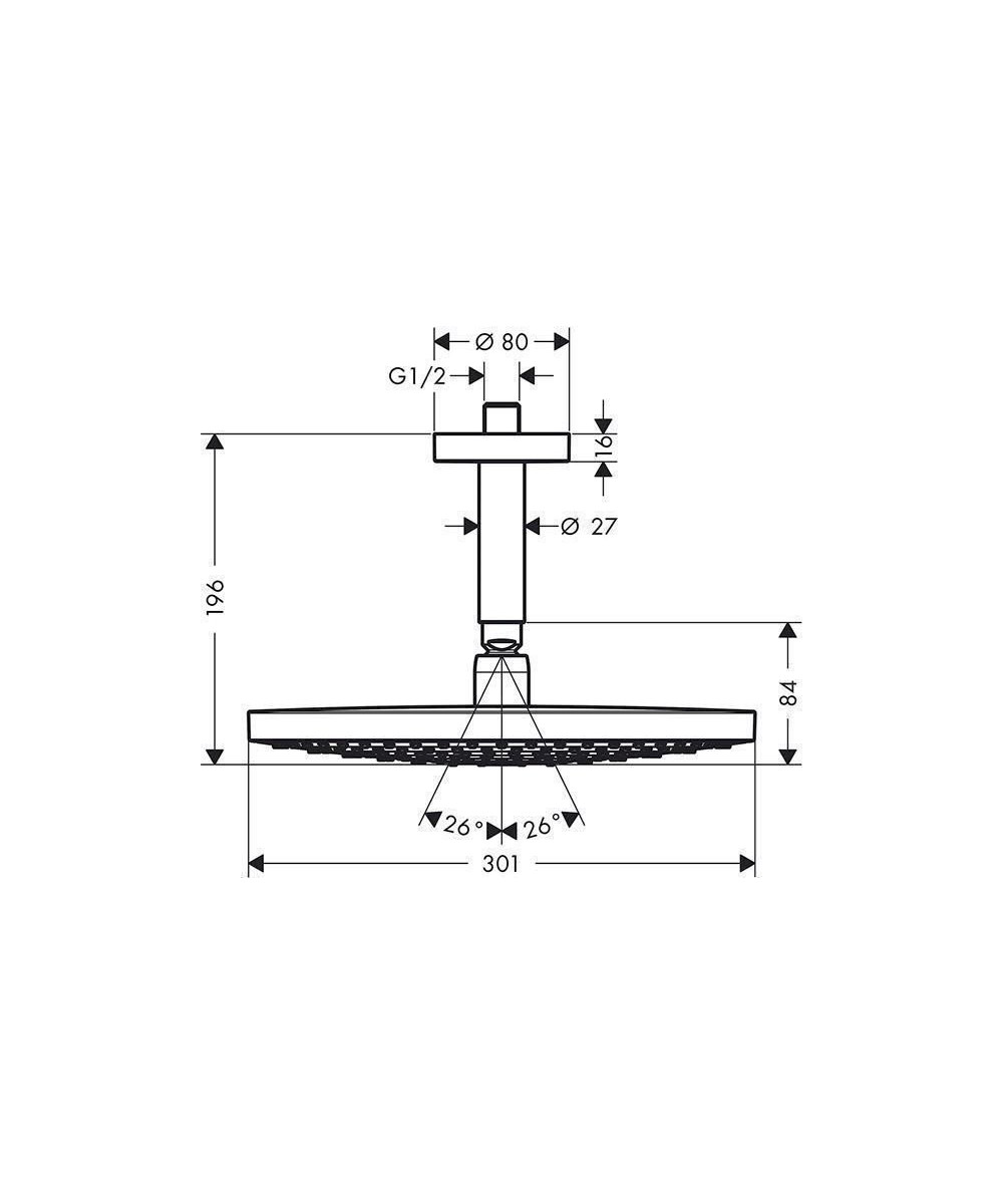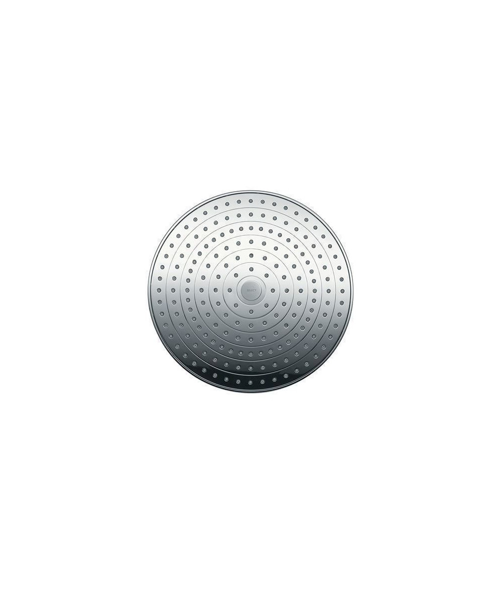 Taille de la tête de douche: 300 mm, Type de jet: Jet Rain, RainAir (jet pluie enrichi d'air), Débit du jet Rain (sous 3 bars de pression): 17 l/min, Débit du jet RainAir (sous 3 bars de pression): 17 l/min, Réglage du type de jet: inversion via le bouton Select sur la douche de tête, Surface du disque de jet possible en deux finitions : chromé ou blanc, Matériau du disque de jet: métal, Disque de jet amovible pour nettoyage, Longueur du raccord de plafond: 100 mm, Type d'installation: plafond