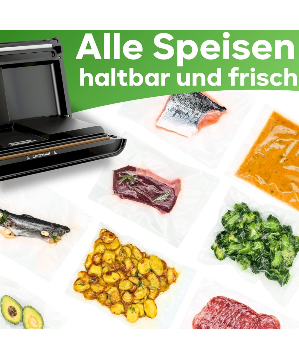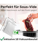 • Inkl. 18 Profi-Frischhaltebeutel mit diagonaler Rippenstruktur für optimale Vakuumierergebnisse (10 Stk. à 22 cm x 30 cm / 8 Stk. à 28 cm x 40 cm, auch als Zubehör erhältlich)