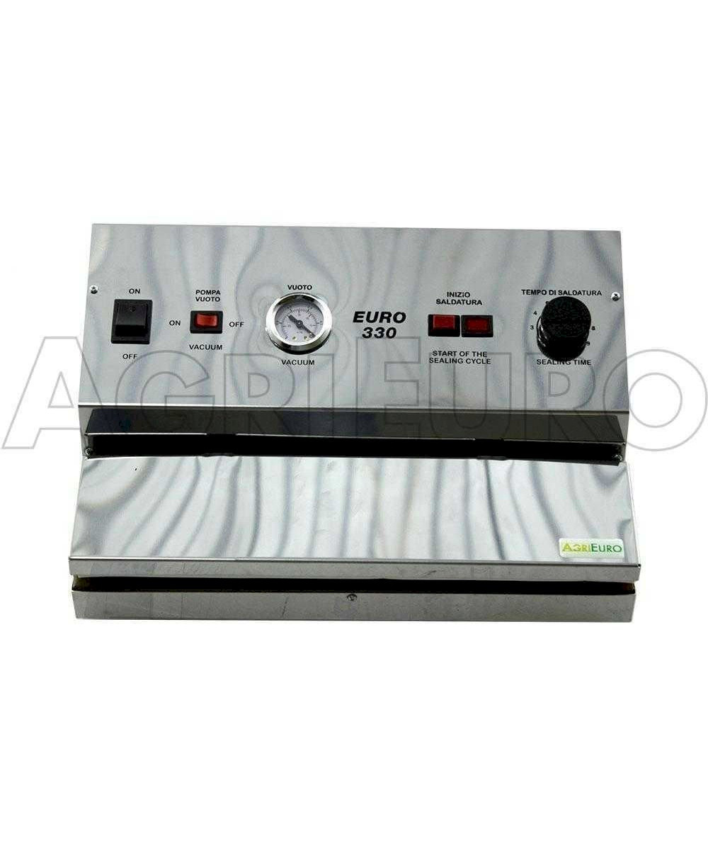 - La machine sous vide Euro 330 Inox est équipée d’une poignée tournante permettant le réglage du temps de soudure. Le réglage des temps de soudure permet de choisir en fonction des sacs utilisés.