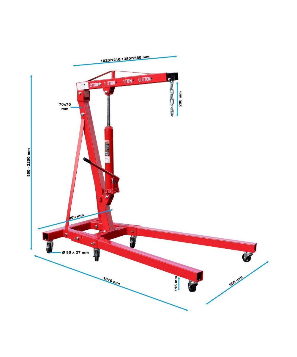 Cette grue d'atelier robuste et en même temps mobile est une aide indispensable et polyvalente dans chaque atelier. La grue compacte, en acier de haute qualité, est à commande hydraulique et peut être utilisée de manière flexible grâce à sa flèche réglable en 4 niveaux. Sa capacité de charge maximale de 2000 kg lui permet de soulever même les charges les plus lourdes, comme les moteurs de poids lourds.