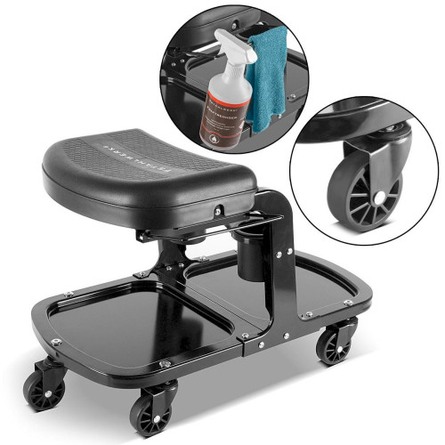 - Siège à roulettes d'atelier mobile avec deux porte-boîtes ou porte-bouteilles, de grandes cavités de rangement, un porte-outils intégré et un porte-serviettes rétractable.
