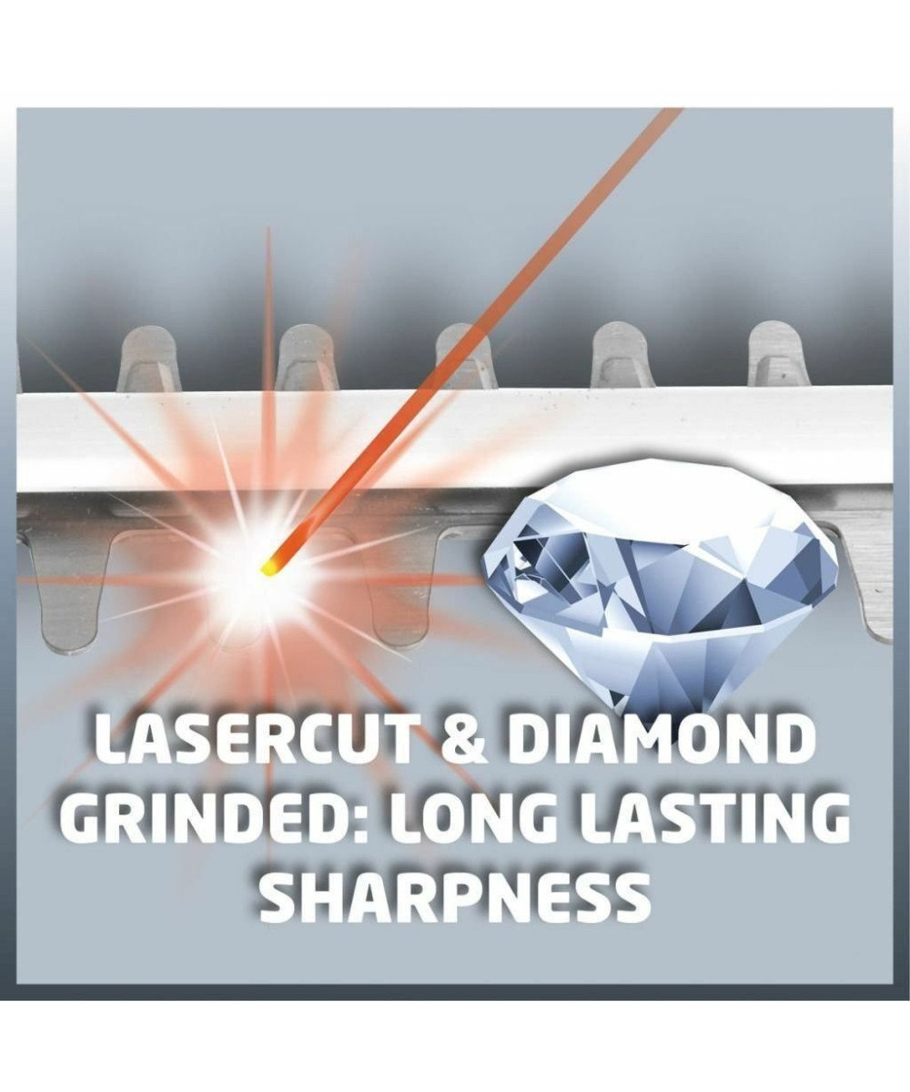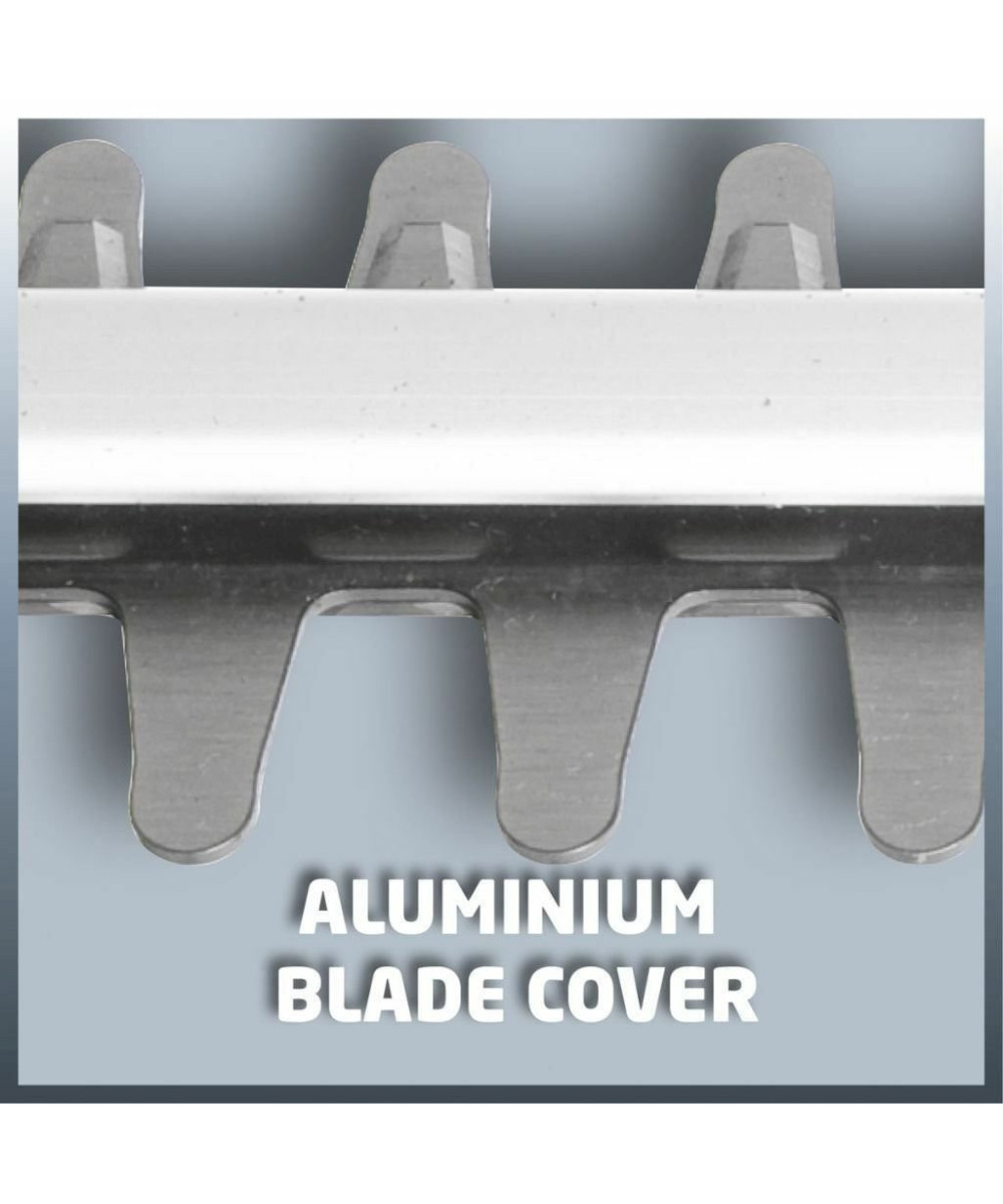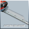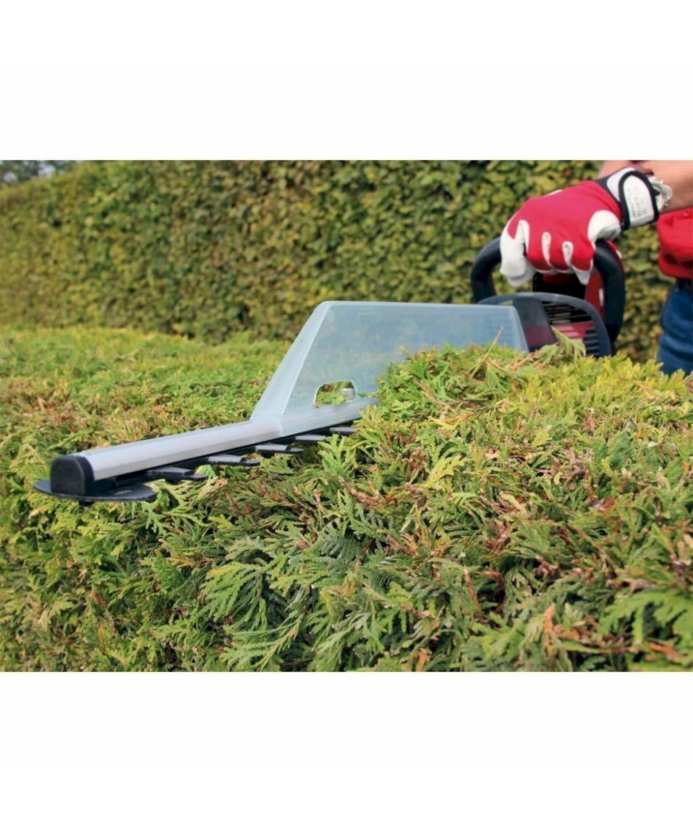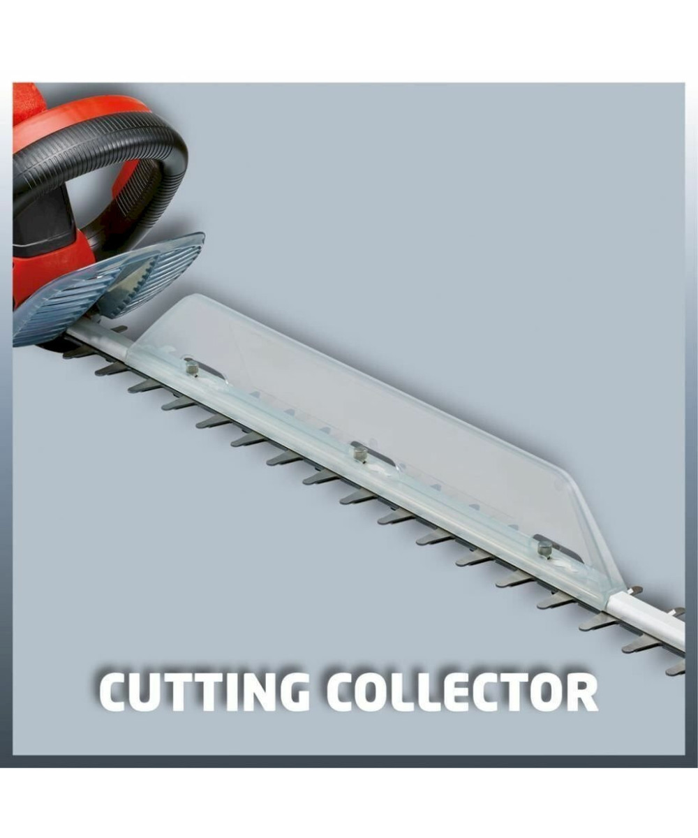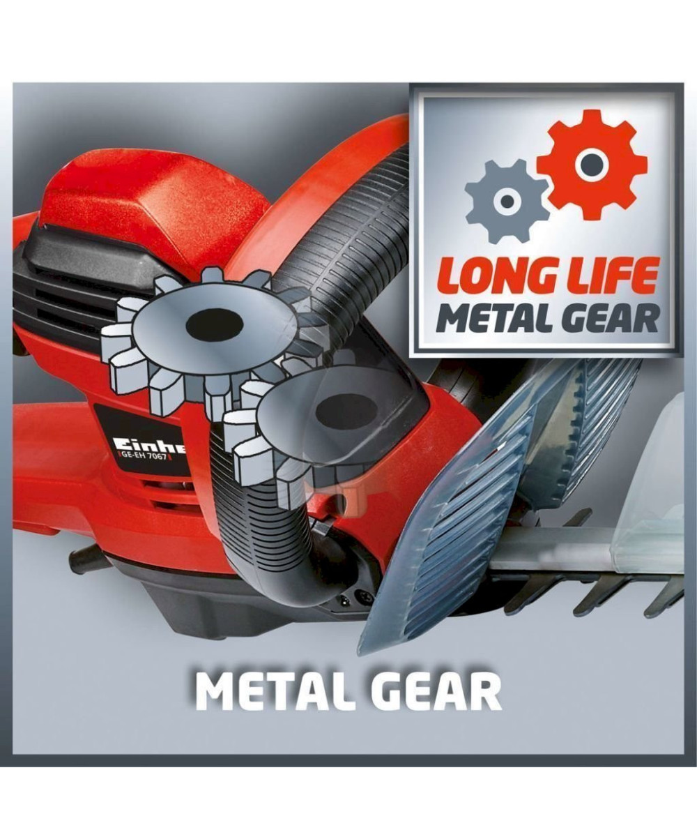 Le taille-haies électrique Einhell GE-EH 7067 permet une taille facile des haies, buissons et fourrés. C'est un outil puissant grâce à sa longueur de coupe de 670 mm et à ses 700 Watt. Les lames sont en acier, découpées au laser et affûtées au diamant. Il est équipé d'un engrenage métallique pour une longue durée de vie. La poignée supplémentaire assure une bonne prise en main. La poignée arrière est pivotante. L‘interrupteur à 2 mains avec frein de lame inférieur à 1 seconde assure la sécurité. Une grande protection des mains, un guide porte-lame en alu et une butée de protection sont d'autres points forts du taille-haies. Un collecteur de taillures assure un ramassage parfait des débris sur le haut de la haie.