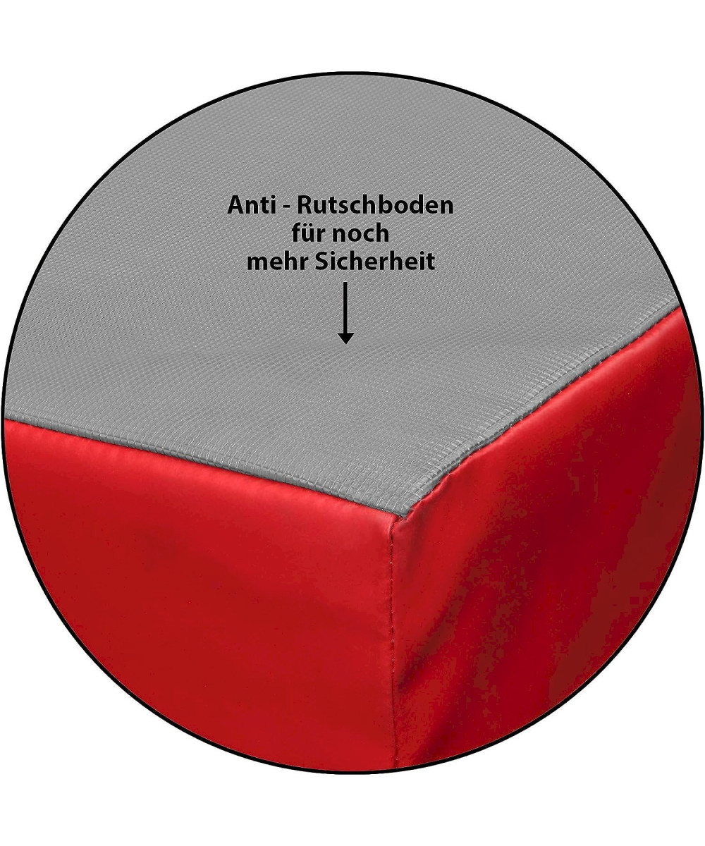 La priorité absolue est de minimiser le risque de blessure. Ce tapis est équipé d'un fond spécial antidérapant, ce qui lui confère un haut degré de résistance au glissement. Le noyau est composé d'un remplissage en mousse de polyuréthane RG 20 (20 kg/m3 ). RG signifie poids spécifique et indique le degré de dureté du tapis. Plus le poids spécifique est élevé, plus la structure cellulaire est petite, c'est-à-dire plus le noyau est dur.