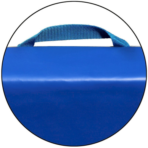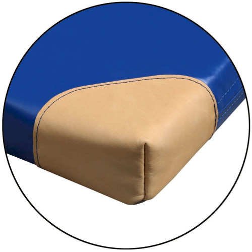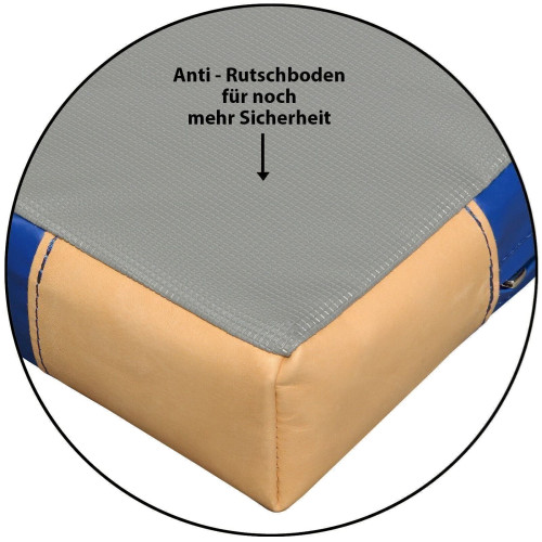 Äußerlich zeichnet sich diese Matte durch einen rutschhemmenden Turnmattenstoff an der Unterseite sowie einen blauen, nahtlosen Planenstoff an der Oberseite und den Seiten aus. Dieser Planstoff besteht aus reißfestem, hautsympathischen Kunstoff- Polyester- Gewebe. Lederecken schützen die Matte vor äußeren Einflüssen und verlängern somit ihre Lebensdauer. Zudem ist der Bezug mit fest angenähten Tragegriffen ausgestattet. Hierdurch kann die Matte senkrecht in beengten Geräteräumen problemlos abgestellt werden. Bitte beachten Sie unsere anderen Artikel. Dort finden Sie auch Matten ohne Lederecken oder ohne Anti-Rutschboden. Ein starker Vollpolyester Reißverschluss erlaubt die Entnahme des Kerns.
