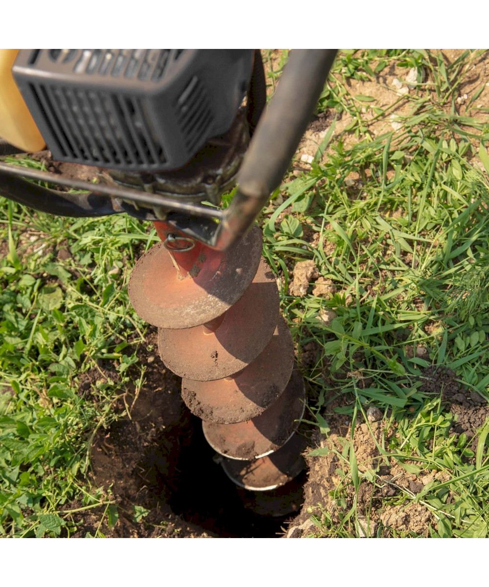 La tarière est équipée d’un moteur de 3 CV d’une cylindrée de 63,3 ccm qui peut atteindre jusqu’à 183 tours par minute. Les forets en fonte robuste d’un diamètre de 100, 150 et 200 mm, garantissent un forage de manière précise et propre, dans presque tous les types de sol.