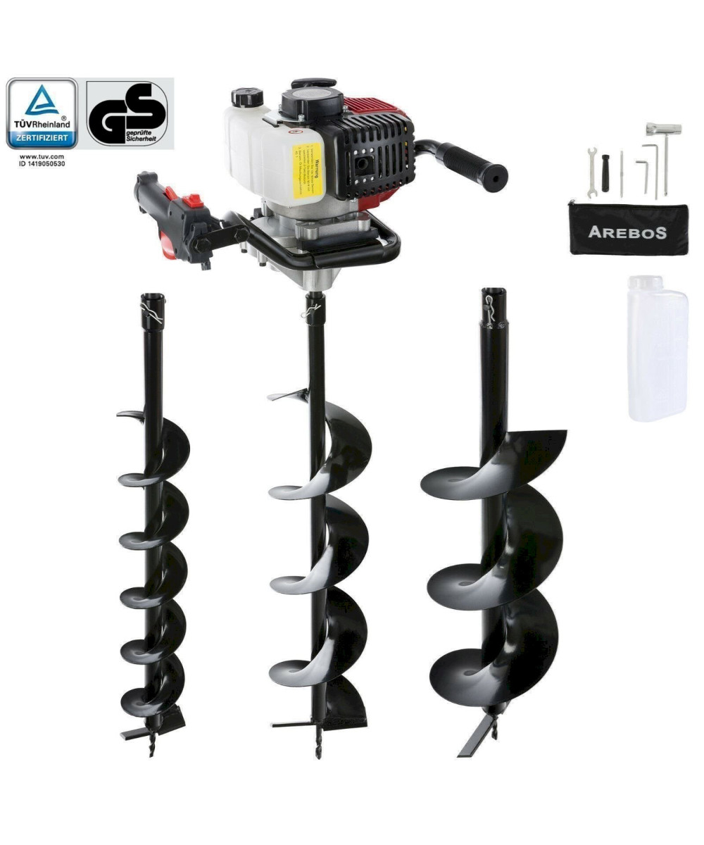 Arebos TARIÈRE Thermique essence 2,18 HP 52CC + 3 sabots de forage (100 - 150 - 200mm)