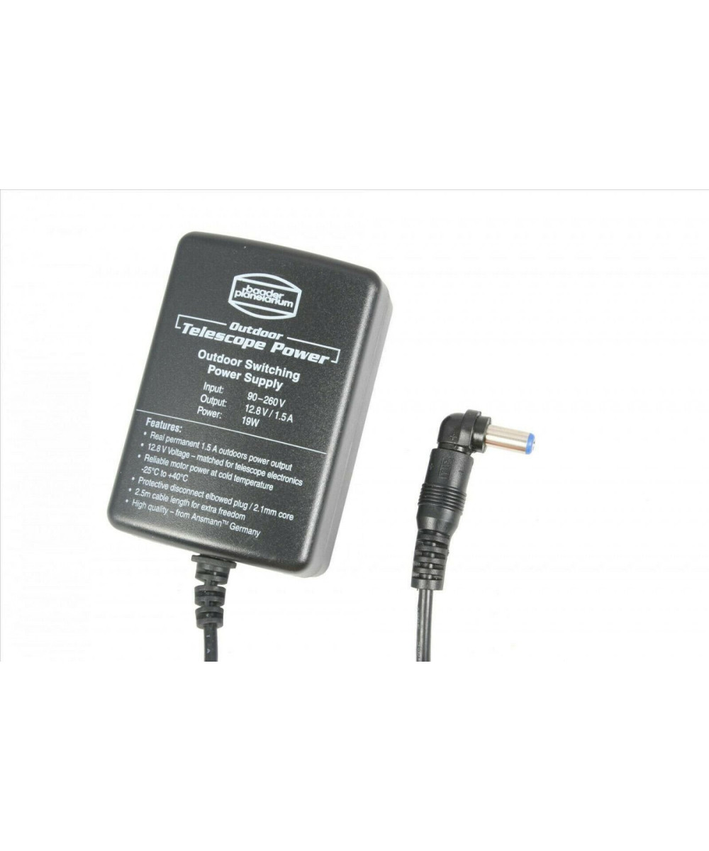 La nouvelle alimentation extérieure pour télescope peut être alimentée par les tensions alternatives usuelles de 90 à 260 V et fournit une tension continue de 12,8 Volt/1,5 A et même à des températures extrêmement basses, la faible chute de tension n'empêche pas le bon fonctionnement des composants électroniques ou des moteurs de la monture. Avec une puissance en continue de 1,5 A/19 Watts, la réserve de puissance disponible est suffisante, même à pleine charge, avec une forte instrumentation sur la monture et des variations de ch