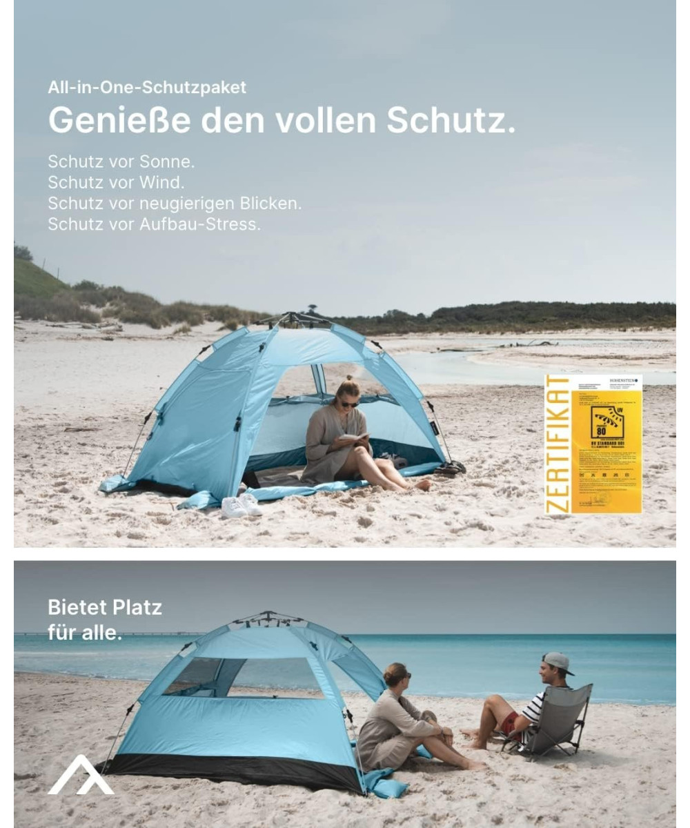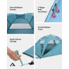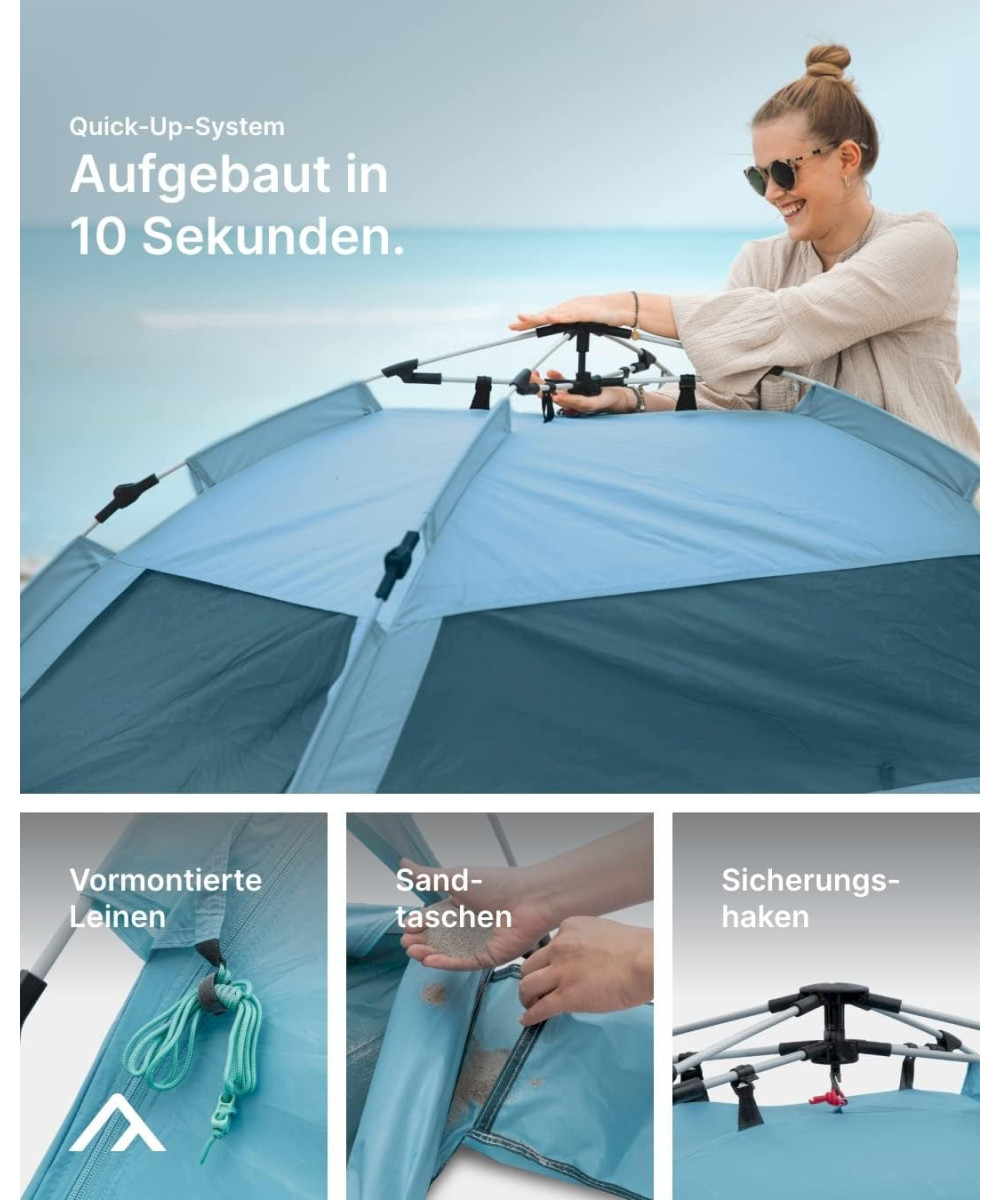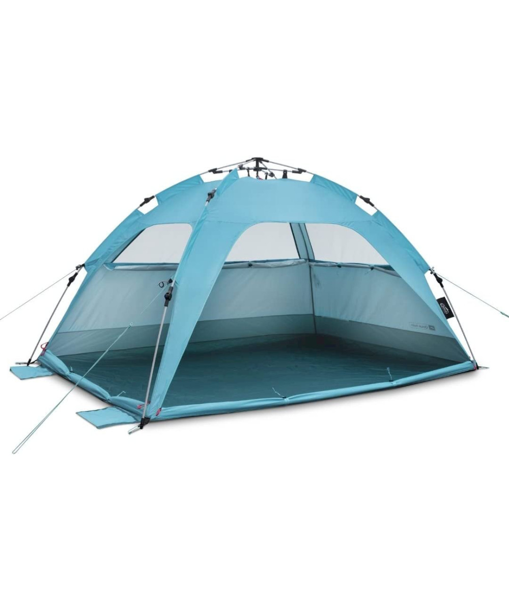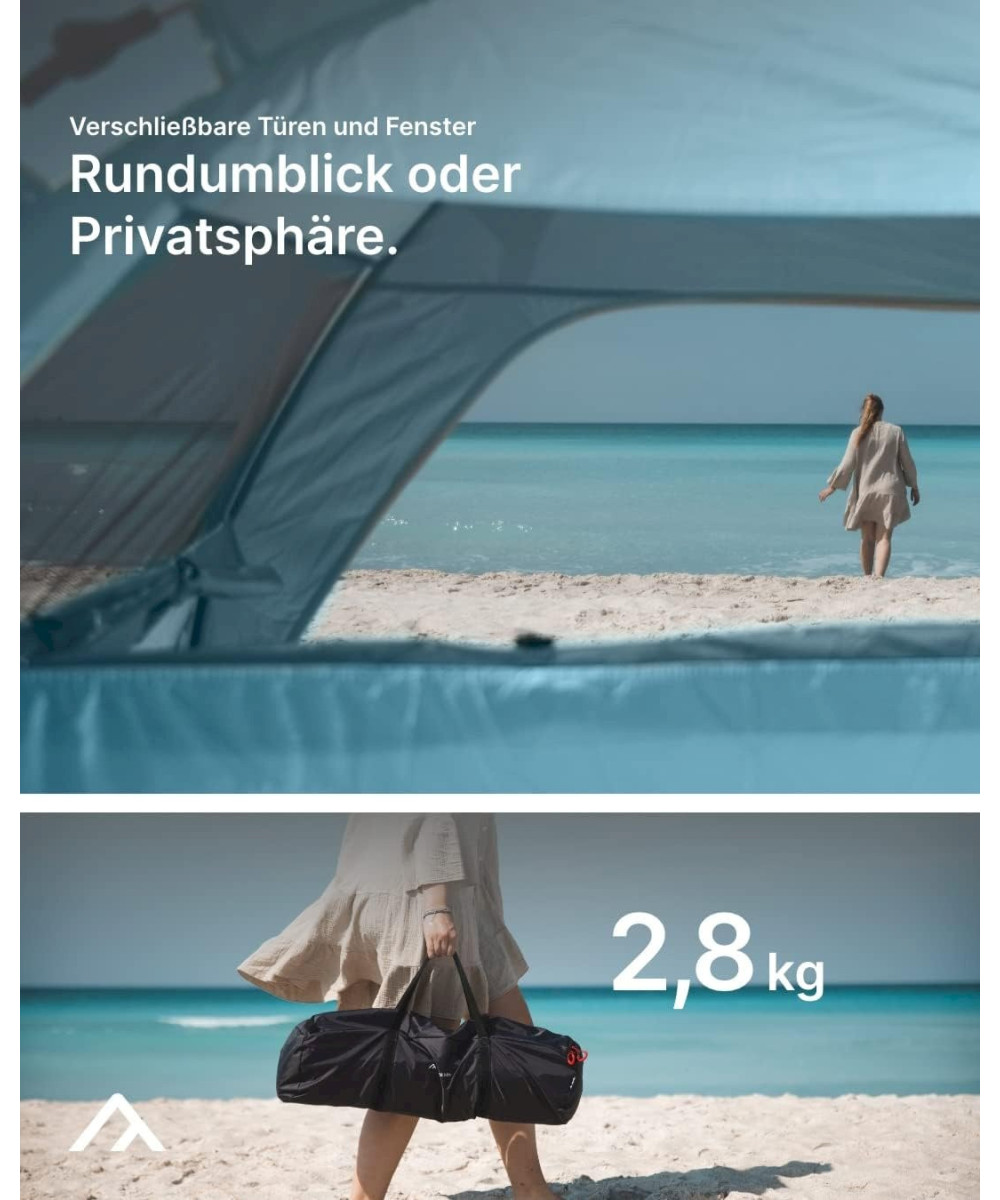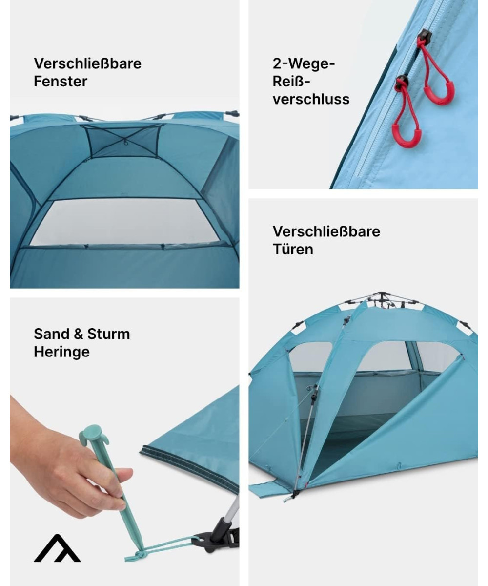 Les quatre sacs de sable sur les côtés sécurisent la stabilité du petit pavillon de plage. De plus, la tente peut être fixée avec des haubans et des sardines en plastique solide par vent fort.