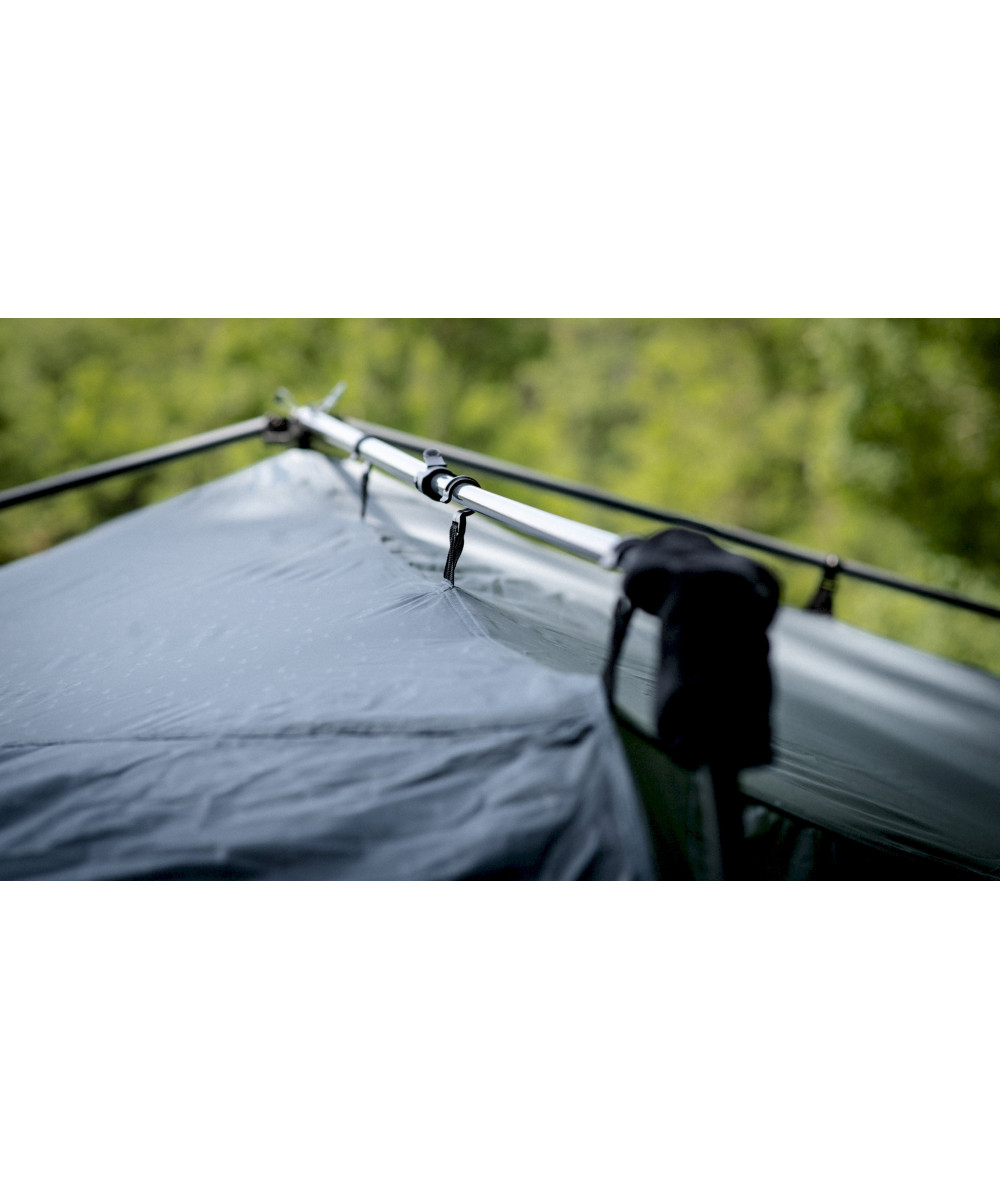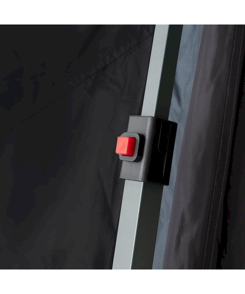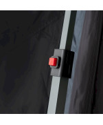 Dans la tente, il y a non seulement des poches pratiques en filet, mais aussi un œillet de plafond. Ainsi, tout ce qui est important est toujours à portée de main et la lampe trouve également sa place. - Fixations