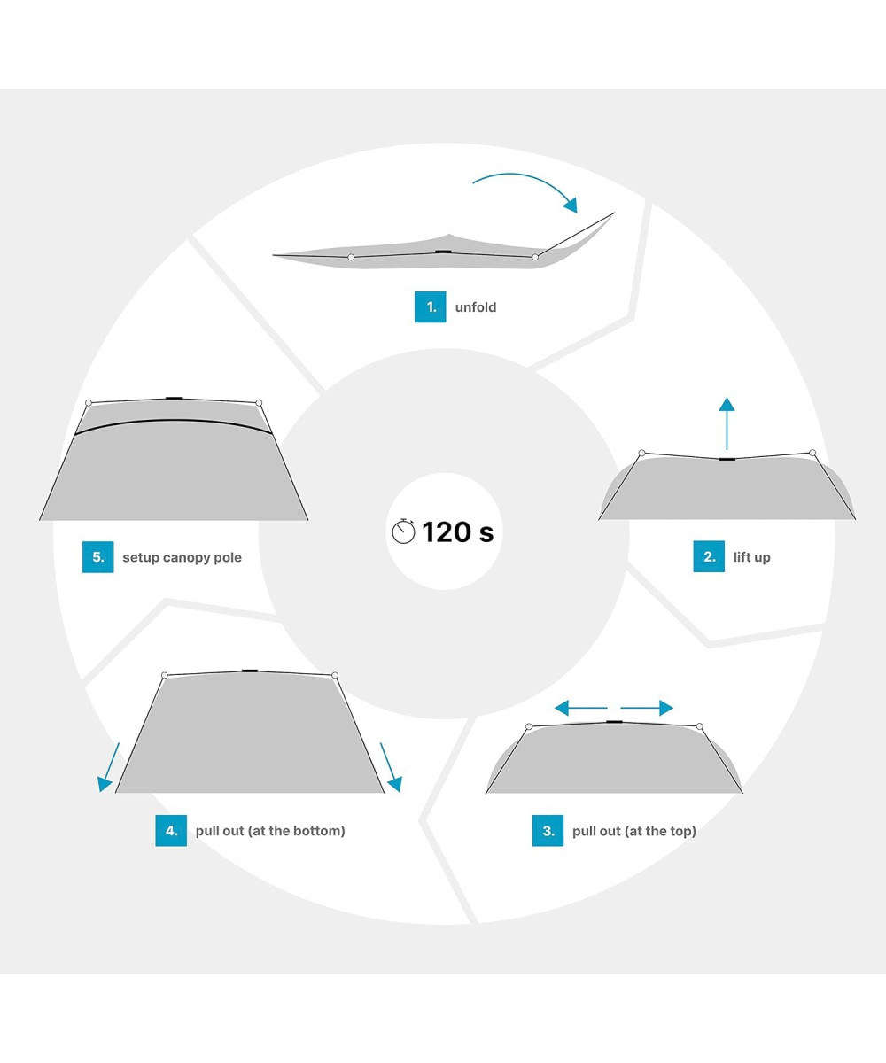 L'armature est télescopique et déjà intégrée dans la tente. Déballez, dépliez et sortez l'armature - c'est tout !