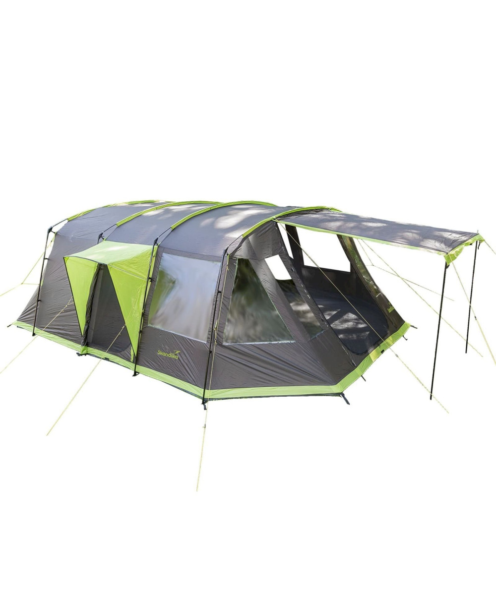 - Grande tente tunnel à parois verticales pour 6 personnes avec tapis de sol cousu.