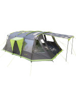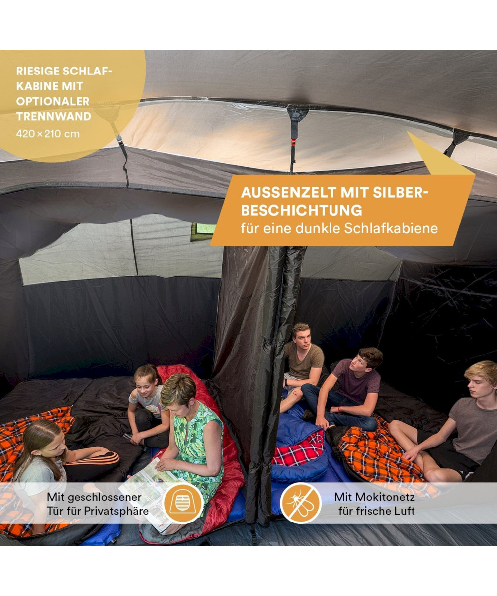 La grande cabine de couchage pouvant accueillir jusqu'à 6 personnes à l'arrière de la tente peut être divisée par une cloison enroulable pour plus d'intimité. Des inserts en filet dans les portes assurent une bonne ventilation.