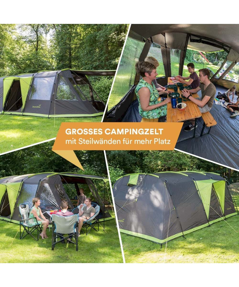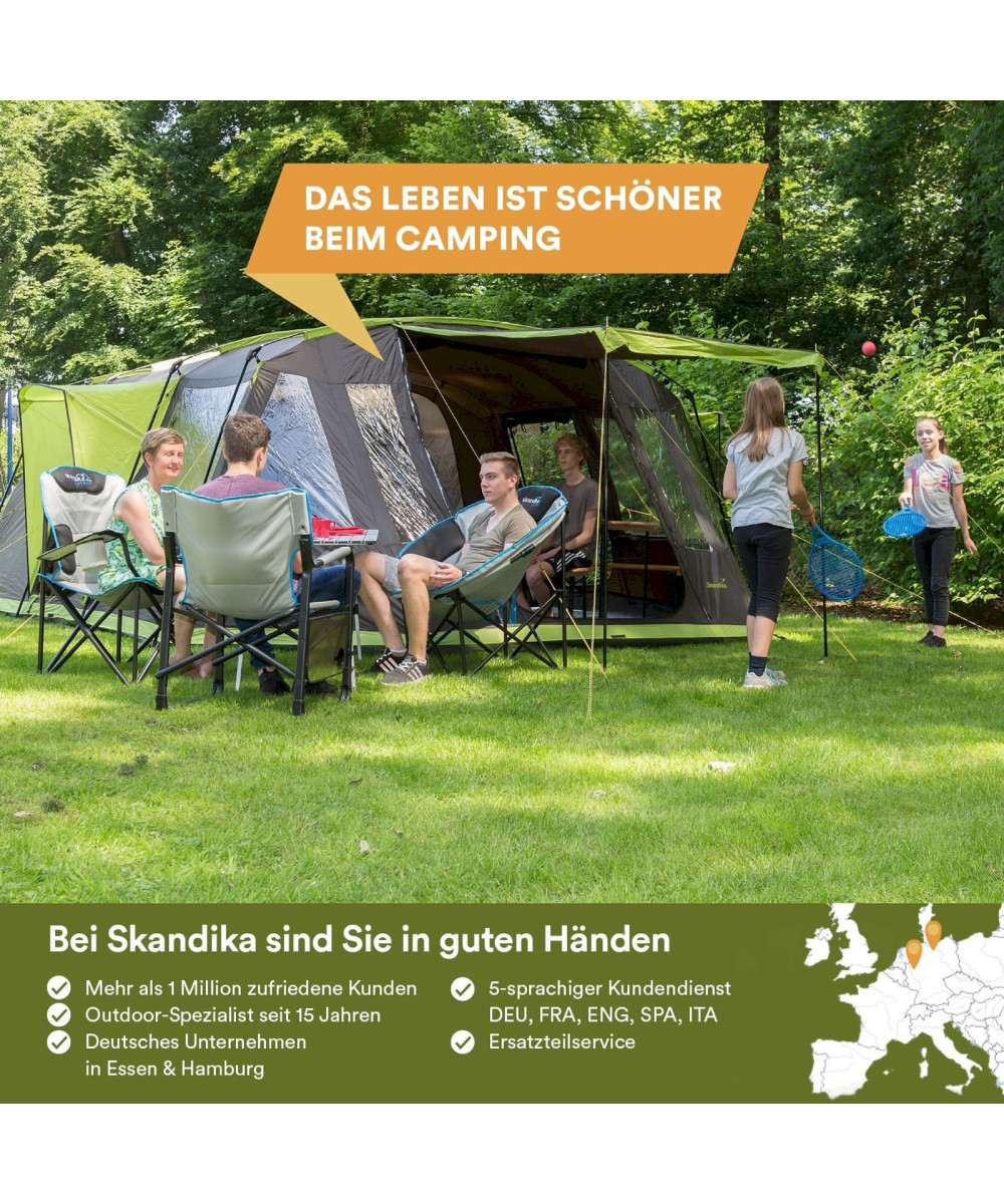Avec sa hauteur debout de plus de 200 cm, la tente Skandika Nordland 6 offre une grande liberté de mouvement et les parois latérales presque verticales permettent une utilisation complète de la surface au sol.
