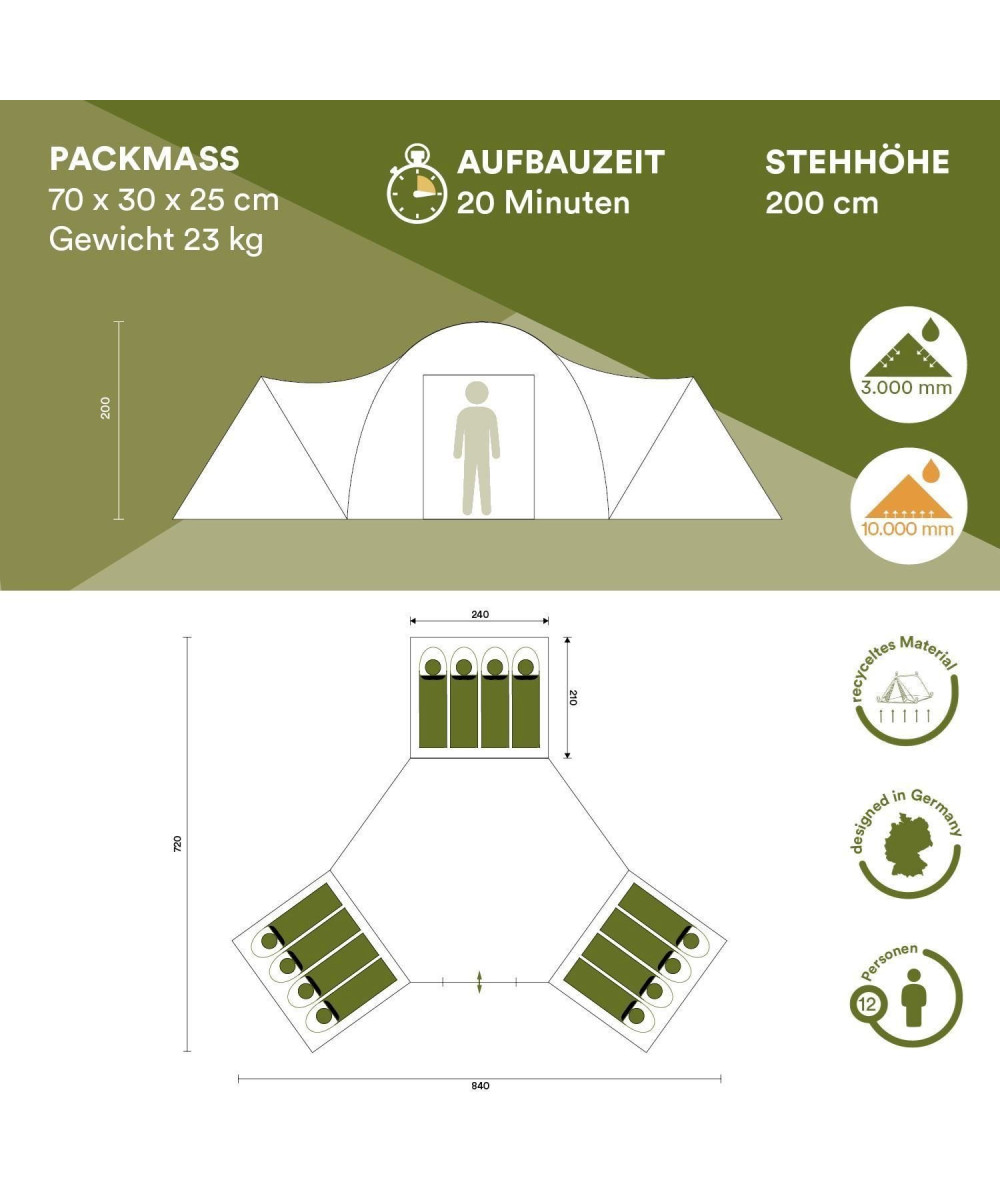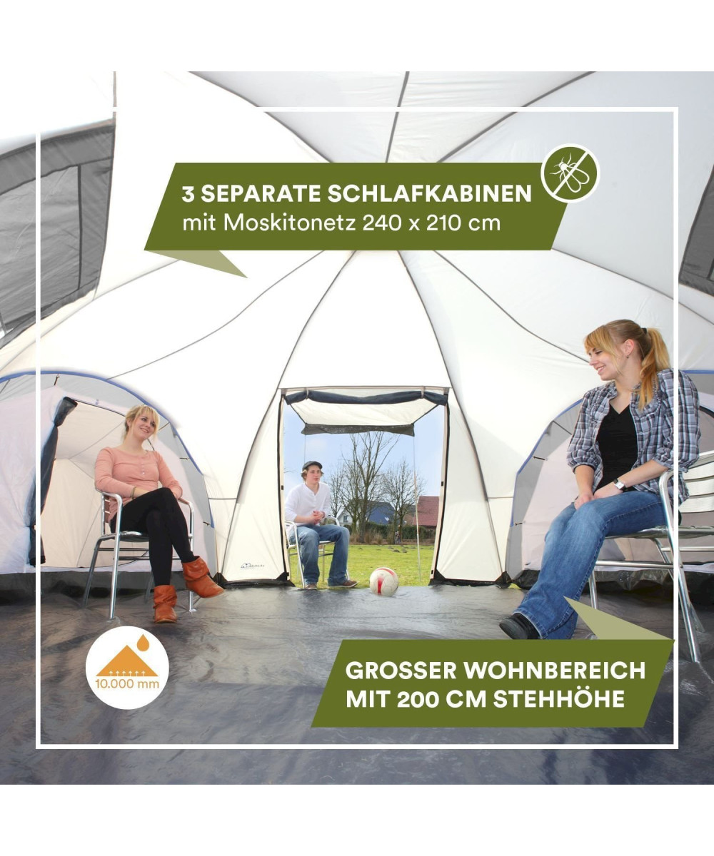 Aux confins des Alpes et des collines du Piémont se trouve la belle ville de Turin. La forme de notre tente igloo Turin 12, qui peut accueillir confortablement jusqu’à 12 personnes, rappelle les collines doucement ondulées. Le cœur de la tente est la zone centrale. Tout le monde se réunit ici, par exemple pour jouer ou manger ensemble – quelque chose de délicieux de la cuisine du nord de l’Italie. Il y a aussi beaucoup d’espace de rangement et l’énorme hauteur sous plafond est impressionnante ! Les trois cabines de couchage sont disposées tout autour. L’entrée de la tente peut être transformée en voile solaire pour créer encore plus d’espace pour toute la famille ! Typiquement skandika nous avons pensé à tout : les moustiquaires à l’entrée principale et les cabines de couchage éloignent les invités indésirables. Des poches de rangement et un crochet pour les lampes suspendues rendent la tente très confortable. Bien sûr, grâce au matériel de tente imperméable et aux coutures scellées, Turin 12 est adapté aux intempéries, de sorte que tout le groupe peut se détendre et profiter de vacances sans soucis !