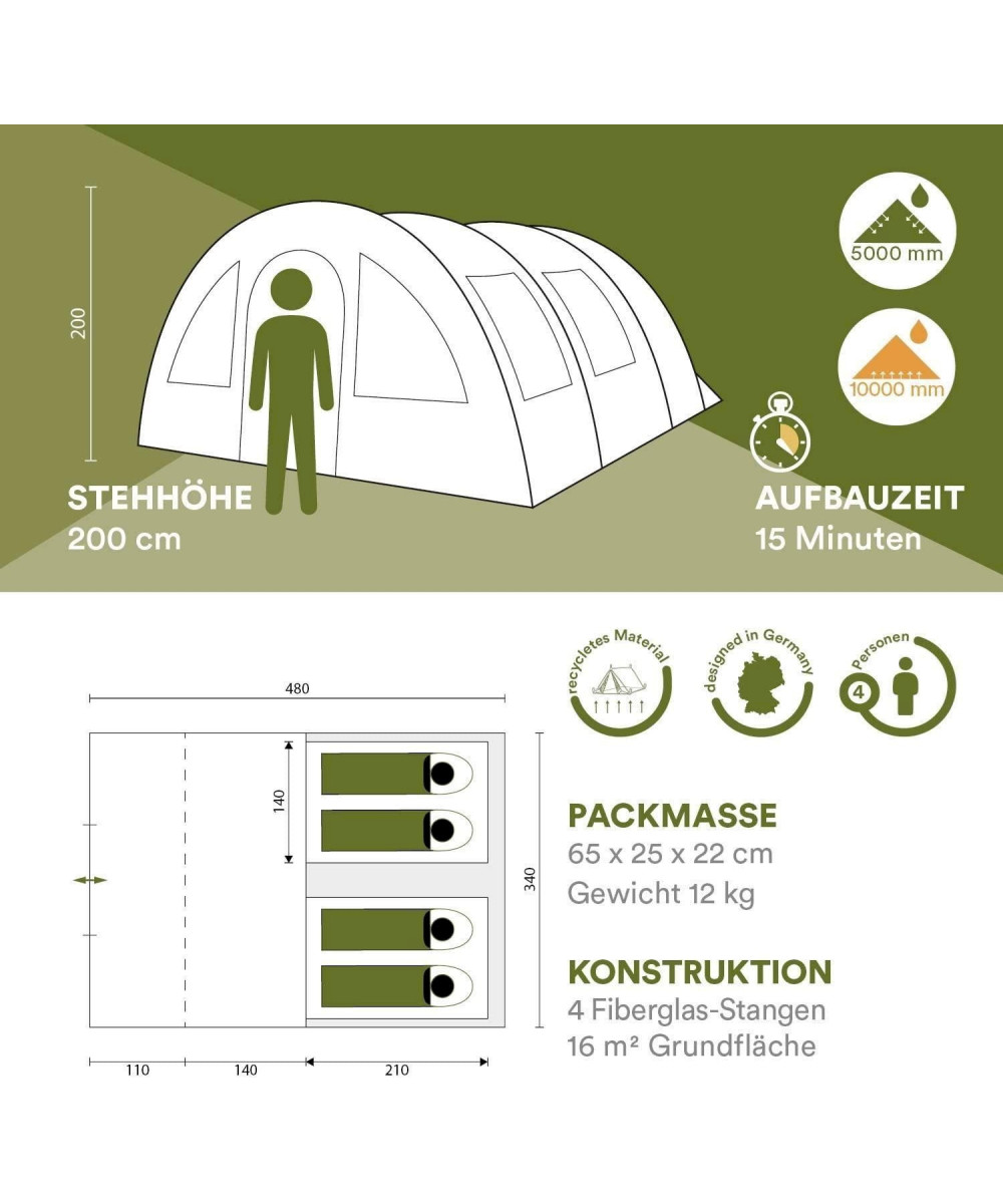 - La tente tunnel est rapide et facile à monter, stable et d'une hauteur confortable de 200 cm. La colonne d'eau de 3000 mm et les coutures étanches assurent une bonne protection contre les intempéries et beaucoup de confort.