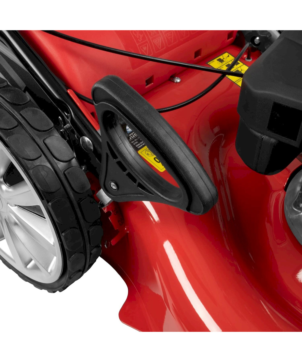 La tondeuse à gazon Güde BIG WHEELER 554.3 R est le choix parfait pour les amateurs de jardinage qui attachent de l'importance à la performance, au confort et à la fonctionnalité. Sous le châssis stable en tôle d'acier revêtue par poudre se cache un puissant moteur Power-Engine à 4 temps, qui ne transpire pas même lors de travaux de tonte exigeants. La poignée de conduite ergonomique, réglable en hauteur pour s'adapter aux besoins de l'utilisateur, garantit un maniement confortable. De plus, le réglage central de la hauteur de coupe sur 6 positions facilite la tonte des surfaces de gazon les plus diverses. Le sac de ramassage d'une capacité de 65 litres avec indicateur de remplissage vous permet de toujours garder un œil sur la capacité. Pour une mobilité optimale, les roues avant et arrière sont montées sur roulements à billes, avec un diamètre de 300 mm à l'arrière et de 200 mm à l'avant, ce qui facilite les manœuvres. Grâce à la pompe à amorçage, le démarrage de la tondeuse est toujours facile. Un autre point fort est le coin mulching qui broie finement l'herbe et la répand sur la pelouse comme engrais naturel. Le panneau sur le guidon avec un porte-boisson pratique et un compartiment de rangement offre un confort supplémentaire pendant le jardinage. L'entraînement des roues arrière par le biais de l'engrenage léger activable permet une vitesse constante de 3,6 km/h. Qu'il s'agisse de tondre, de ramasser, de mulcher ou de l'éjection latérale, vous avez toujours la bonne fonction à portée de main avec la BIG WHEELER 554.3 R de Güde.