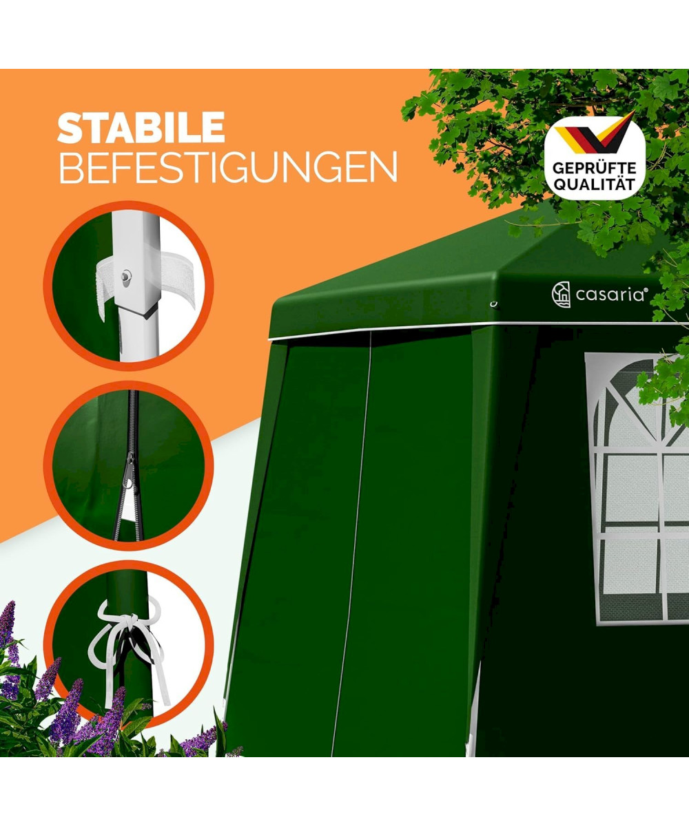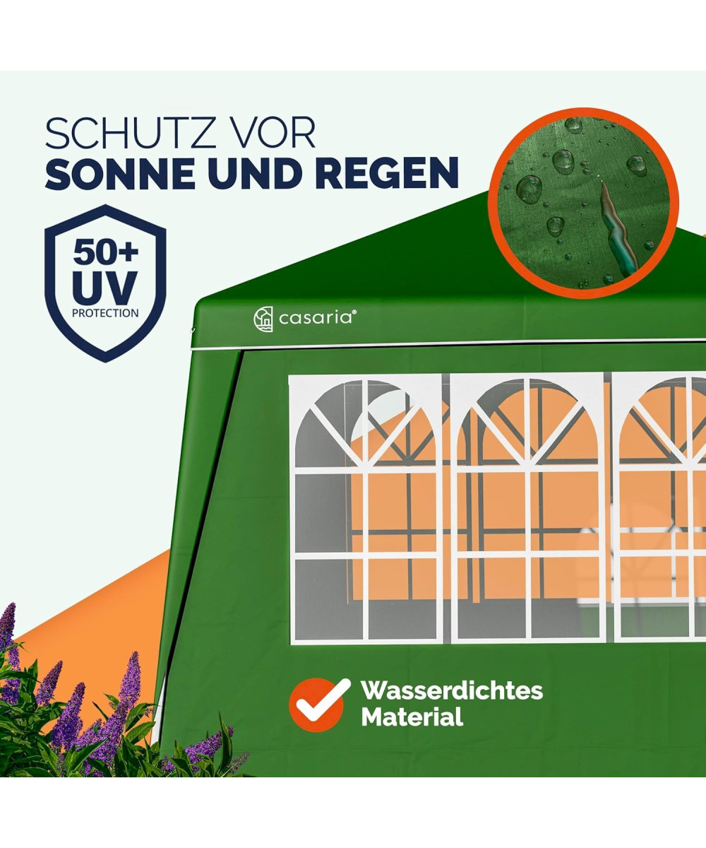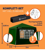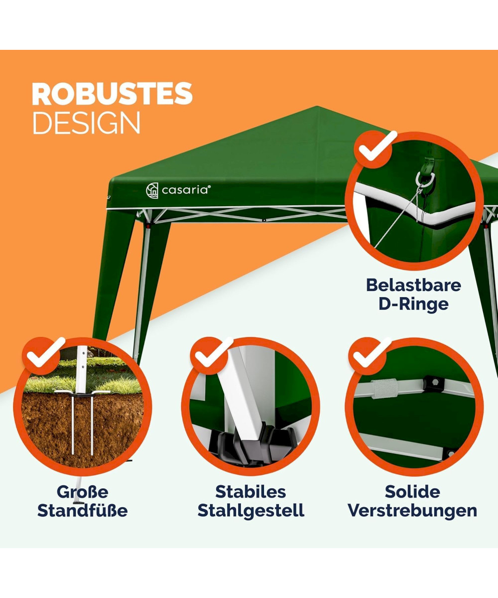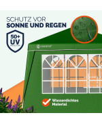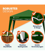 Les pavillons ont une structure en acier de haute qualité avec revêtement par poudre, 4 cordes de serrage et 8 piquets de terre apportent une stabilité supplémentaire. La tente peut être parfaitement utilisée en camping, lors de festivals ou dans le jardin grâce à des entretoises solides et de grands pieds en plastique.
