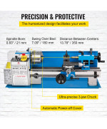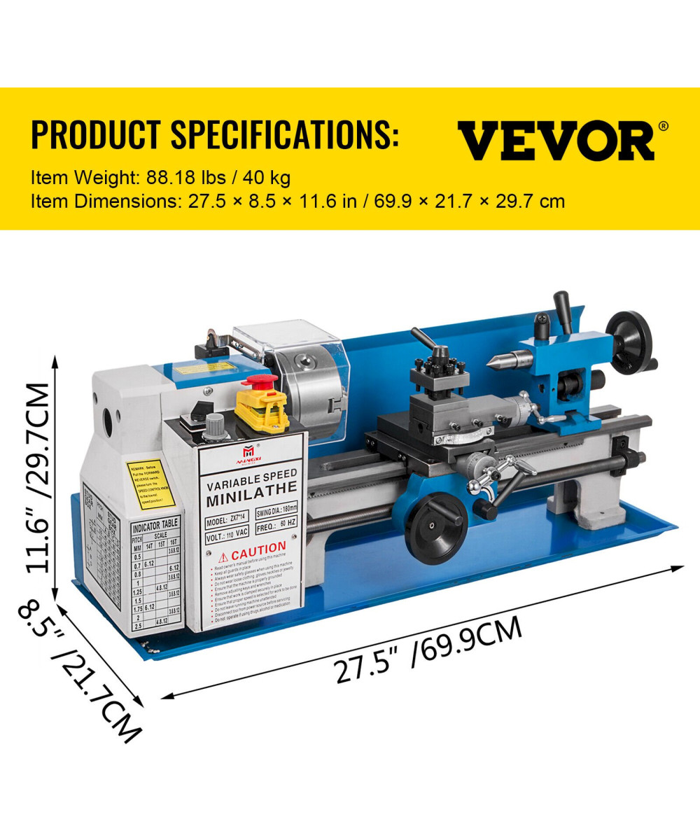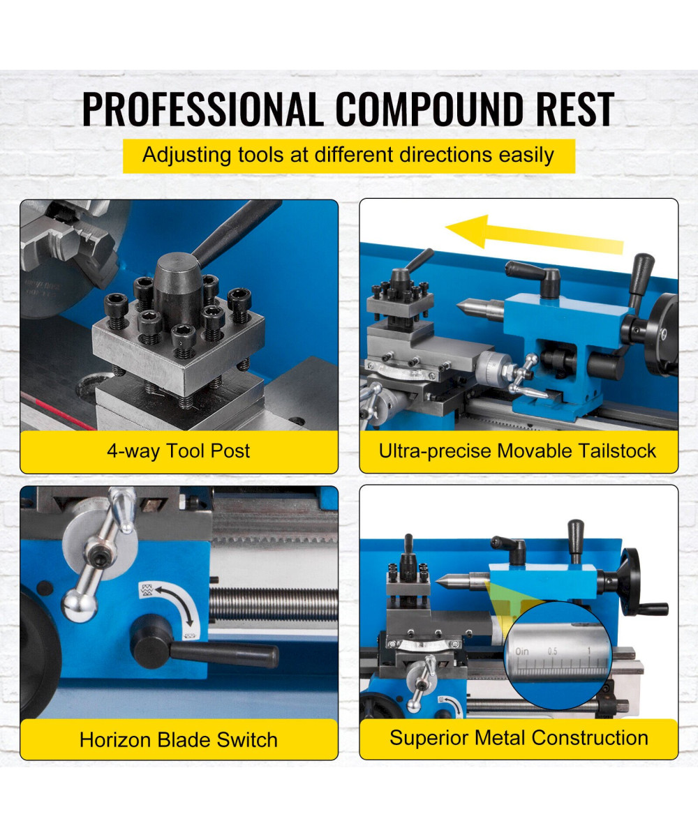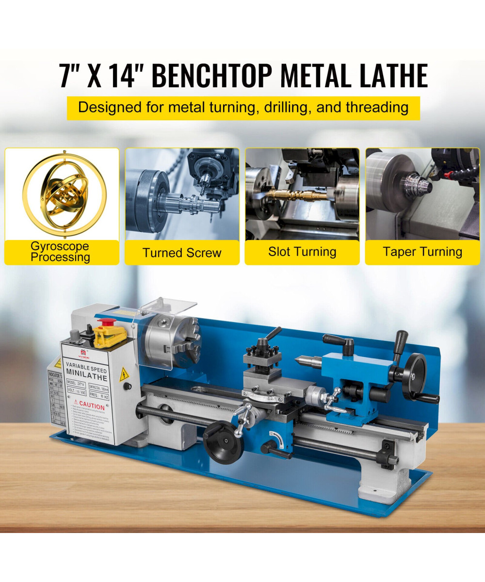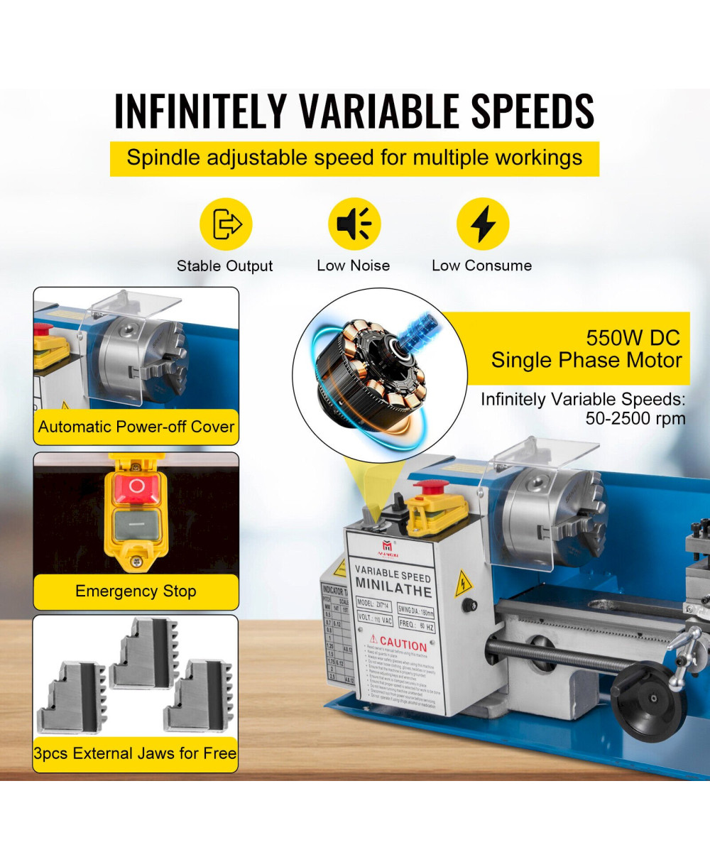 Le mini tour de table de précision de 180 x 350 mm comprend un mandrin à 3 mâchoires, un cône de broche MT3, un cône de contre-pointe MT2, un porte-outil et un moteur de 3/4 HP, conçu pour effectuer divers types de tournage de métal, simple à utiliser. Grâce à un processus de trempe à haute fréquence et à un meulage de précision d'un lit en fonte de haute qualité. Sous-niveau de vitesse de broche de 50 à 2500 tr / min. Le contrôle de vitesse et vitesse de la broche à deux tranches est réglable en continu. Une lampe mobile est incluse. Vous n'en reviendrez pas de la robustesse de notre tour à métaux.