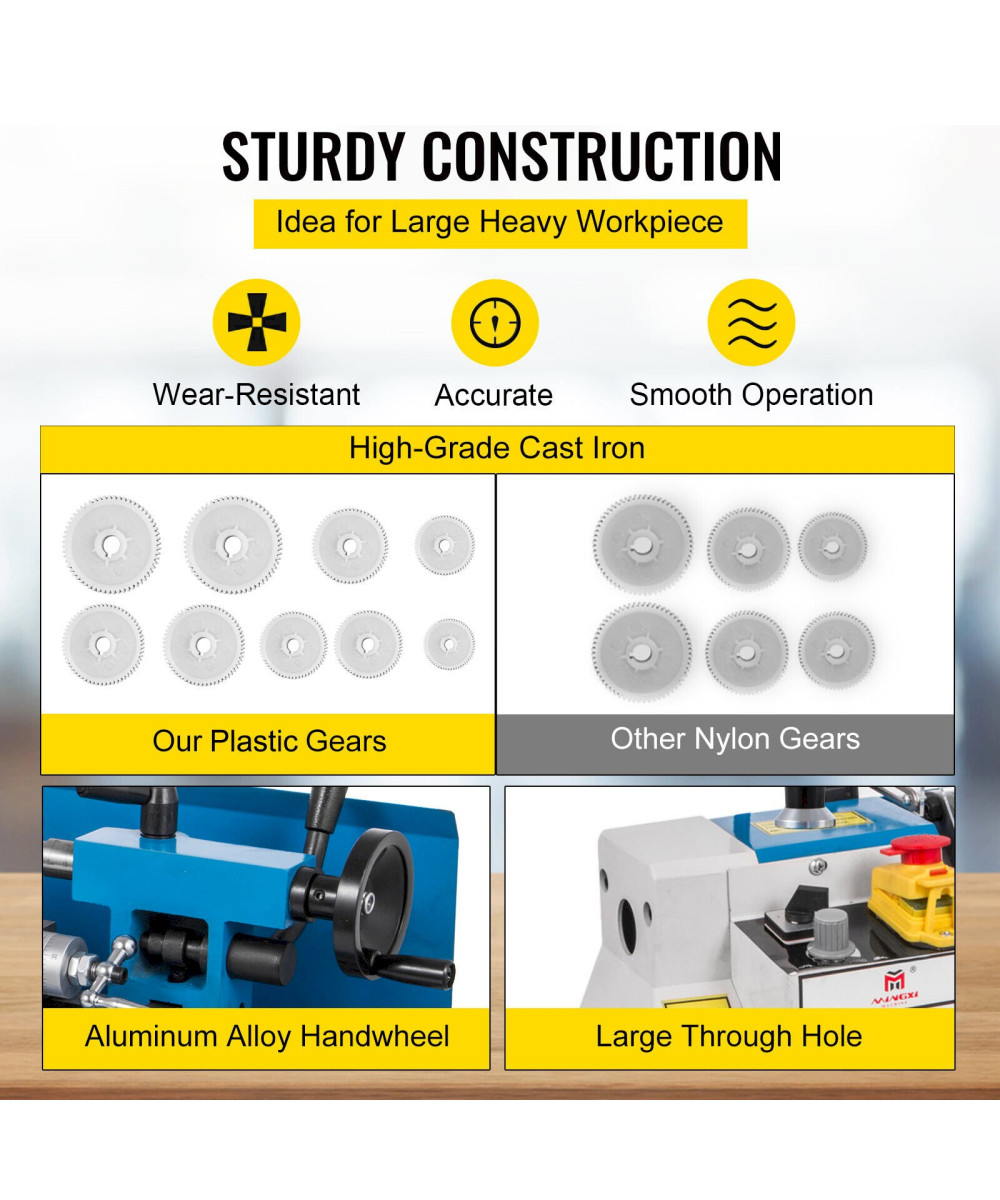 Fabriqué en fer de qualité supérieure, ce qui lui permet de longues années. Il se compose d'une balançoire de 180 mm au-dessus du lit et une distance de 350 mm entre les centres. Le large trou traversant permet de travailler facilement avec des pièces longues et fines, y compris des goupilles, des bagues, des essieux et des arbres. - Contrôle de la Vitesse en Continu