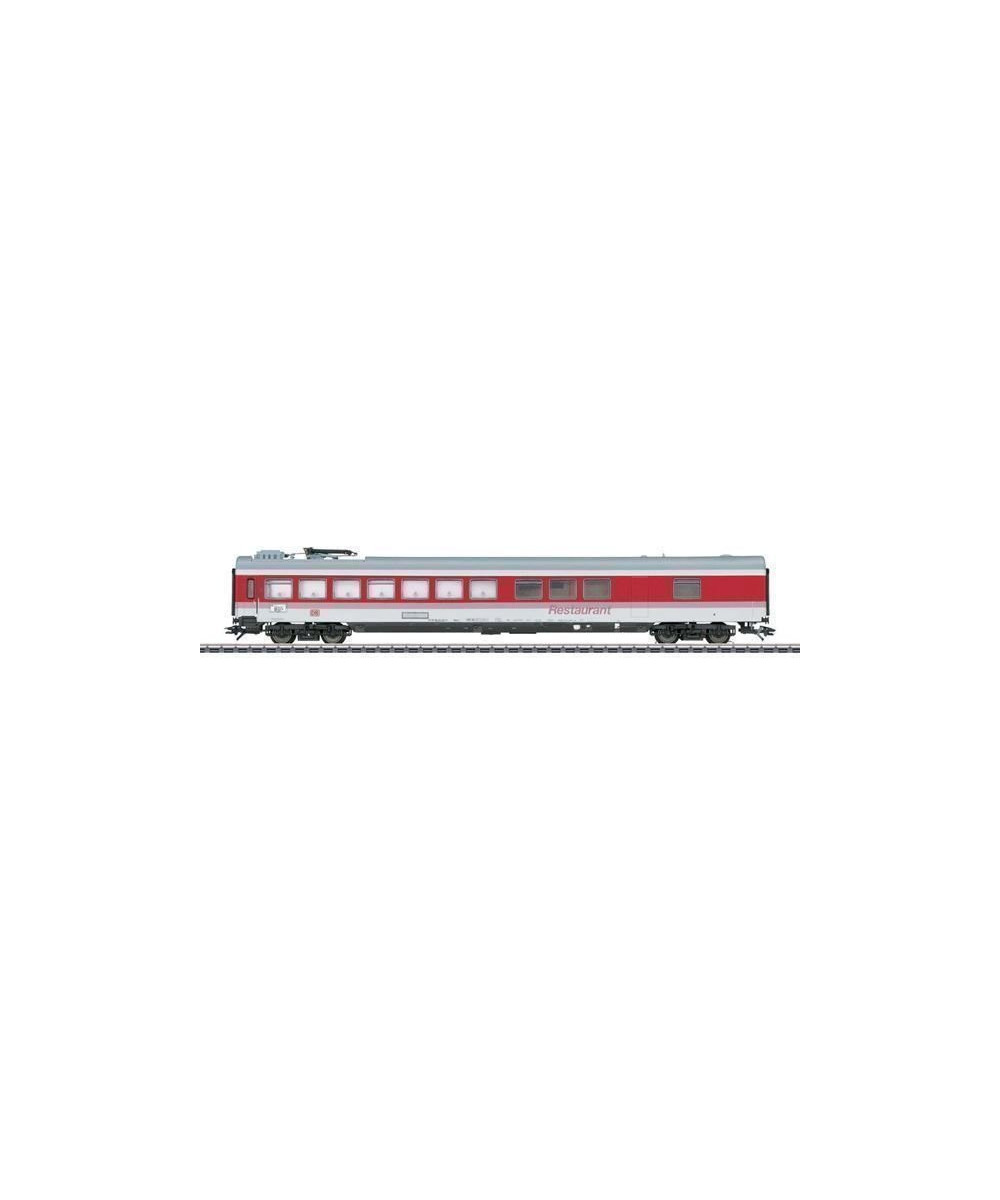 Speisewagen WRmz 135.0 der Deutschen Bahn AG (DB AG) des EC 9 „Tiziano“, im Einsatz zwischen Braunschweig und Chiasso. Produktfarbgebung. Mit Einholm-Stromabnehmer und kleinem Dachtransformator. Betriebszustand Sommer 1995.