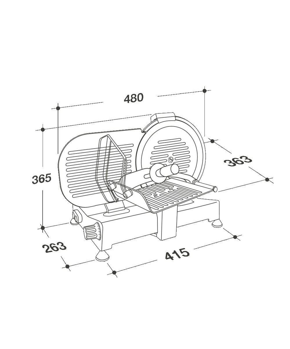Aux dimensions de 48x36x38 cm et au poids de 15 Kg la RGV Luxe 25GS se révèle une trancheuse robuste de dimension moyenne et adaptée à une durée d'utilisation prolongée.
